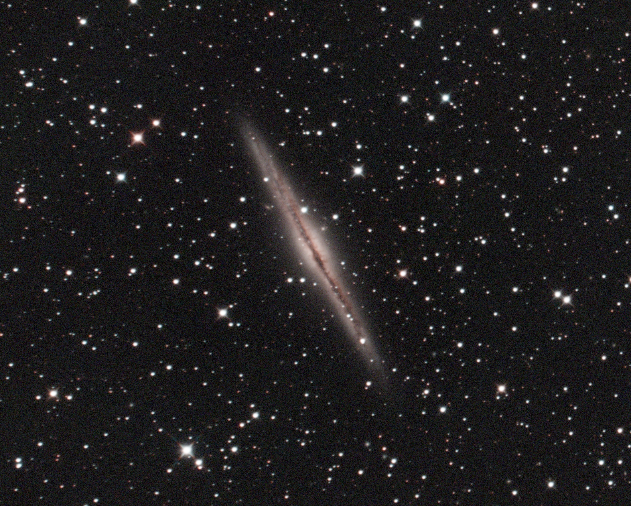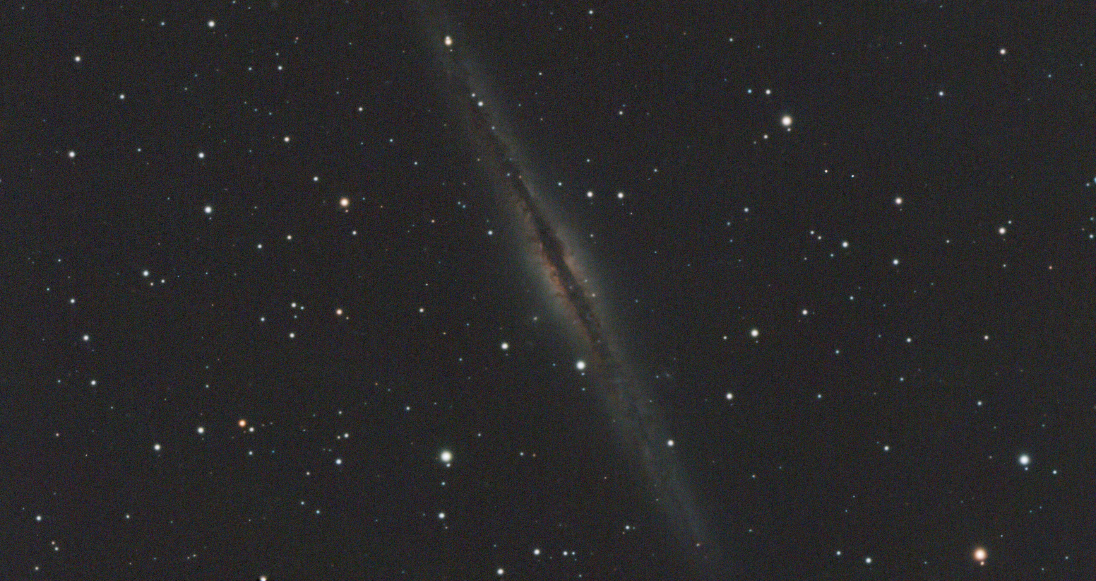| Peter Branson captured this image of NGC 891 on September 24th 2025 from 167 x 30 second images. These images were captured using a ZWO ASI585MC colour camera attached to a Celestron C9.25 Schmidt-Cassegrain telescope, mounted on a SkyWatcher NEQ6 mount. The set of images was stacked in Nebulosity and imported into PixInsight for further processing and sharpening. Image Credit: Peter Branson. |
