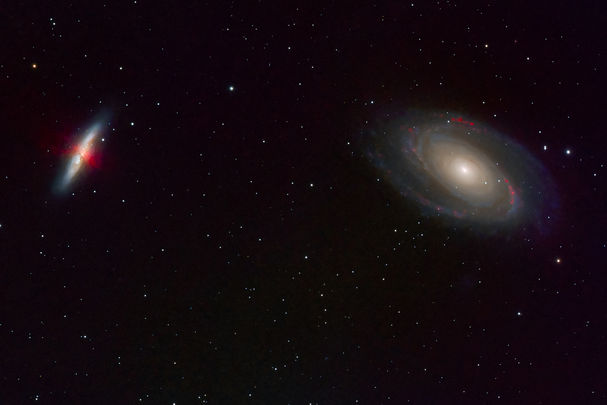 This image of M81 (right) and M82 (left) was captured in 2019 by Chris Callaway. It has been enhanced using 4 hours of H-alpha data taken in February 2025. Both the original image and additional H-alpha data were captured using a Takahashi 106 telescope on a Paramount MyT mount, and the camera was an Atik 16200. The image has been processed using Astro Pixel Processor, PixInsight and Photoshop. Image Credit: Chris Callaway.