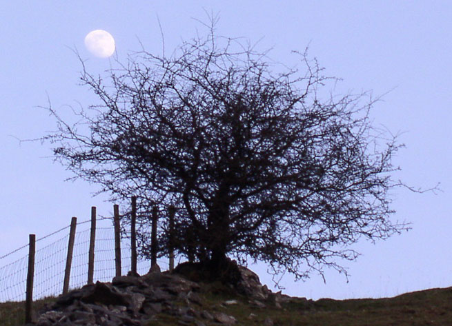 | A gibbous moon rises over a hillside in the Derbyshire Peak District in the following picture taken on the evening of Sunday 13th April 2003 by Mike Lancaster. He used an Olympus Camedia C4000 zoom digital camera. Image Credit: Mike Lancaster. |