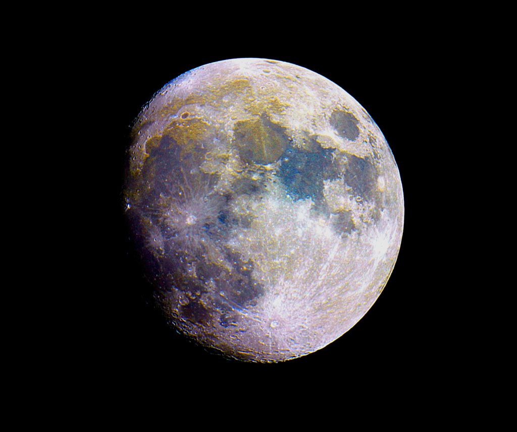 Chris Newsome took the following two images of the Moon on the 29th April 2007. The first is one where the colour has been left unprocessed so the Moon has a 'natural' appearance. In the second the colour has been processed in such a way as to bring out the different rock types making up the lunar surface. The images are a stack of 31 frames taken with a C8-NGT/Moonlite CR-1 and a Canon EOS300D/MPCC combination. Each single image was at 100 ASA and the exposures were of 1/200th second. To achieve the colour processing the image was neutral colour balanced so that when the saturation was adjusted it didn't favour any one colour. Once done, the saturation was increased in three stages of +30 and then in a couple of stages of +10. Once the final colour balance was achieved, the image was unsharp masked and contrast adjusted to achieve the final result. The colours signify areas of differing amounts of metal in the basalts on the mare regions, the bluer the area the more metal, the oranger the area the less metal. Mare Tranquilitatis is very blue in comparison to neighbouring Mare Serenitatis although round the edge of Serenitatis, the metal composite is higher around the edge of the 'shoreline' in comparison to the centre of the 'sea.' Mare Humorum (to the lower left) displays the opposite colourations to Mare Serenitatis. Sinus Iridum, on the other hand, is very clearly low on metals and has a distinct border with Oceanus Procellarum plateau and from the processed image Mare Frigoris, on the northern edge of the lunar face, is low on metal. Also see the NASA GSFC picture of the day for the 7th September 2006 for a similar image by Noel Carboni. More information on the Moon's crustal composition may be found here. Image Credit: Chris Newsome. |