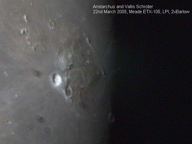 The following image by Chris Newsome taken on the 22nd March 2005 shows the bright crater Aristarchus with the sinuous Schroter's Valley close by. Image Credit: Chris Newsome. |