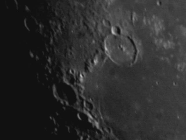 The following image of the 12.5 day old Moon was taken by Chris Newsome on the 8th June 2006. He used a Meade LPI camera with a Celestron C8-NGT telescope. The image is comprised of a total of 11 separate images stitched together in CS2. The 11 images are themselves comprised of a total of 1550 frames stacked in Registax. Chris comments that "The Moon was very low down in the sky and, bearing in mind the heat of the previous day, the atmospheric turbulence was horrendous - it was like looking through a jelly! However the stacking process has helped in eliminating the atmospheric effects to a certain extent although the overall image is still blurred". Looks fine to me Chris - webmaster. Image Credit: Chris Newsome. |