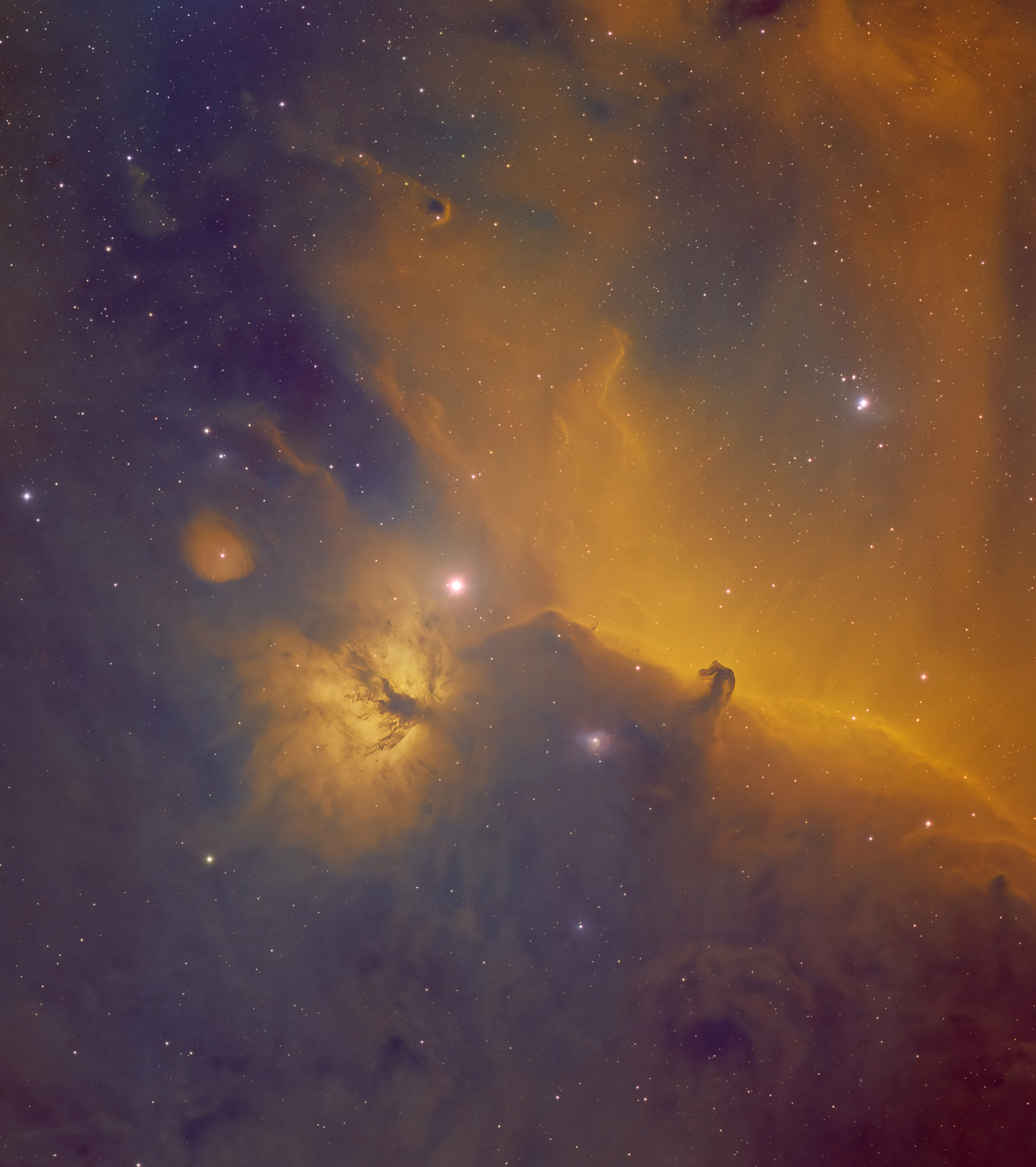 | This image of the area surrounding the star Alnitak, including the Flame and Horsehead Nebulae, is a combination of data captured in 2023 and more recently in December 2025 and January 2026. The data was captured by Chris Callaway using a Takahashi 106 and Atik 16200 camera with Chroma filters on a Paramount MyT. The image comprises 7 hours of Ha data, 5 hours of OIII and 4 hours of SII data, processed in the Hubble palette. Stacking was accomplished using Astro Pixel Processor with processing being achieved in PixInsight and Photoshop. Image Credit: Chris Callaway. |
