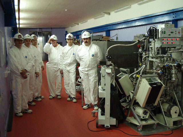 After Sean gave us more background into the facility we then had to go and change our clothing once more. Off came the mine boots and helmets, and we all donned fresh white climb-into zip up clean-suits over our orange overalls. Looking like the Norwegian army on Arctic manoeuvres we then put on trainers and clean helmets and had to pass, one by one, through an airlock to reach the clean room conditions of the experiment area. In the airlock with both doors closed, one stood in a blast of air for 15 seconds to remove any remaining dirt and dust, before emerging into the clean room environment. Here the lab consists of a long gallery and several other rooms housed in a wood and steel framed structure contained inside a purpose built cavern. The walls floor and ceiling of this area are designed to allow for deformation in the surrounding rock. Despite the general stability of the roadways and chambers the rock salt is nevertheless under a high stress at this depth and deforms over time. In fact the material creeps at about the same rate fingernails grow, that is to say up about 1 cm per year. Since the lab was built in 2003 the floor has in places bulged upwards! Despite this unusual fact and the lack of windows one would otherwise have no clue that this air conditioned, brightly lit and squeaky clean world was over 1100 m underground!