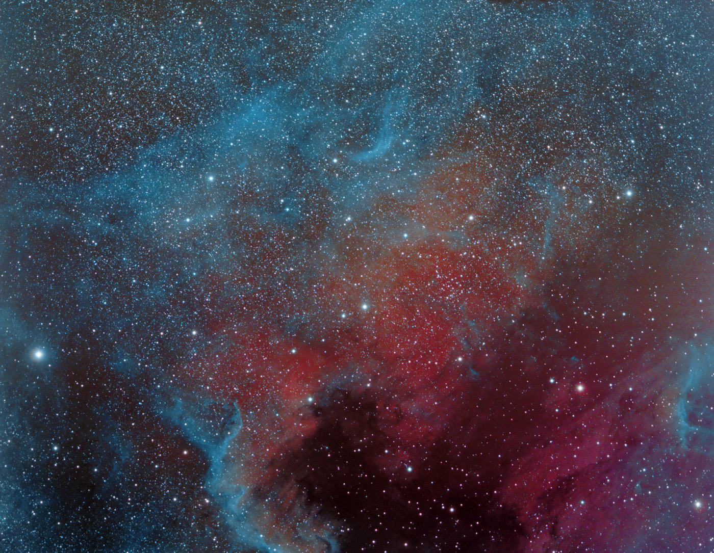 | This image of the North America Nebula was created with data taken by Chris Callaway on 27 Oct and 08 Nov 2019 from Coalville. The image comprised 8 x 10min subs of Ha and 6 x 10min subs of Sii and Oiii with 6 x 10 min subs Luminance added at 25%. Equipment was a Takahashi 106, the camera was an Atik 16200 with Atik filter wheel and filters, the mount was a Paramount MyT. The image was stacked in Astroart, PixInsight was used for Dynamic Background Extraction and SC Noise Reduction with further processing taking place in Photoshop. Ha was assigned to the red channel, Oiii to the green channel and Sii to the blue channel. Image Credit: Chris Callaway. |