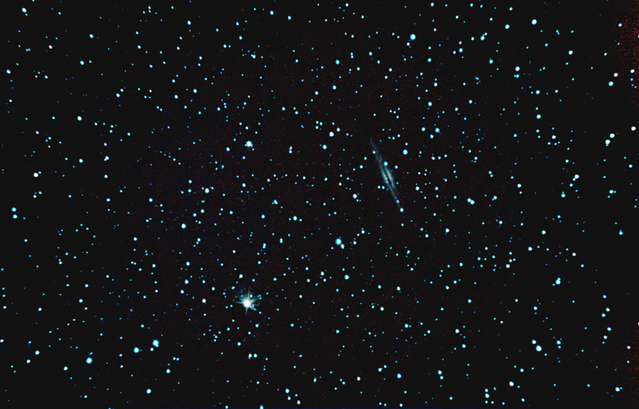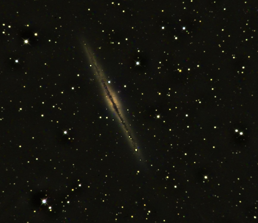 | Peter Branson captured this image of NGC 891 on September 24th 2025 from 167 x 30 second images. These images were captured using a ZWO ASI585MC colour camera attached to a Celestron C9.25 Schmidt-Cassegrain telescope, mounted on a SkyWatcher NEQ6 mount. The set of images was stacked in Nebulosity and imported into PixInsight for further processing and sharpening. Image Credit: Peter Branson. |
