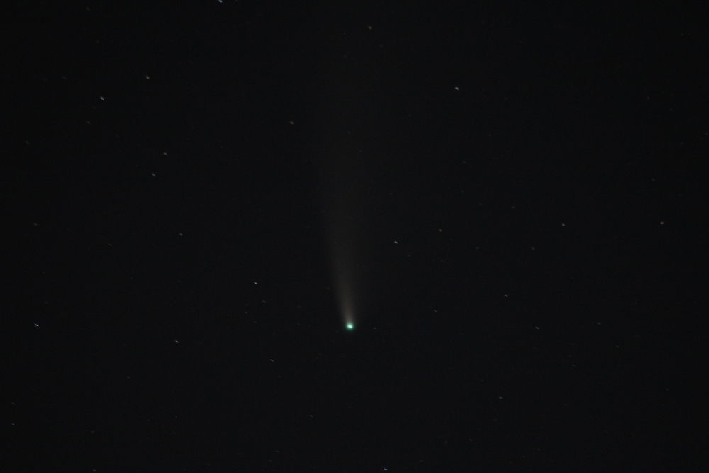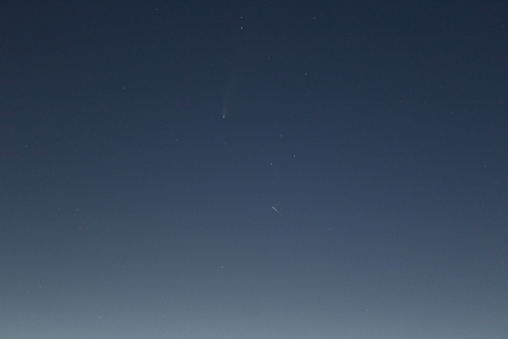 The following images of Comet 2020 F3 Neowise were taken on Sunday 19th July 2020 by Anthony Southwell. All pictures were taken using a Canon EOS 1200D DSLR at f/5.6 and ISO 1600. The first image was taken at 10:04 pm and shows the comet in the upper central part of the image. A meteor has also been captured just below the centre of the picture. The second image, taken at 10:19 pm, highlights the position of the comet using a green laser pointer shone by Simon Behnke. Both these images were taken using a 55 mm lens and a 5 second exposure. The final image was taken at 11:04 pm using a Tamron 70-300 mm telephoto lens at 271 mm and a 10 second exposure. Images Credit: Anthony Southwell.
