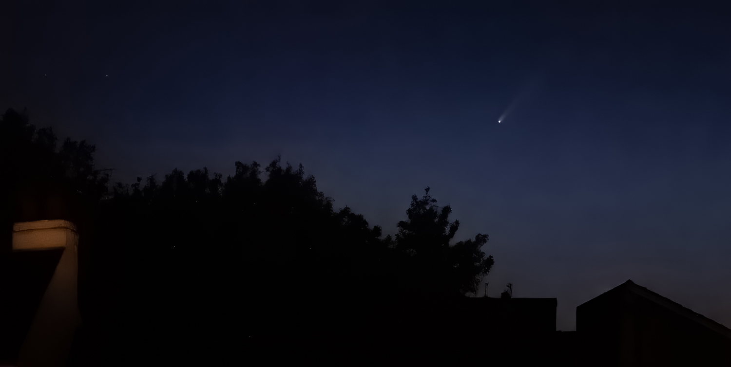 Tony Barker took this image of Comet C/2020 F3 Neowise on the 11th July 2020 at 23:21 BST from a first floor window. The camera was a Fuji XT-2, hand held but supported on the window frame. Exposure was 1/20th second at f 5.6, focal length 50mm, ISO 1600. Post processing was performed in Lightroom and noise reduction in Topaz. Image Credit: Tony Barker.
