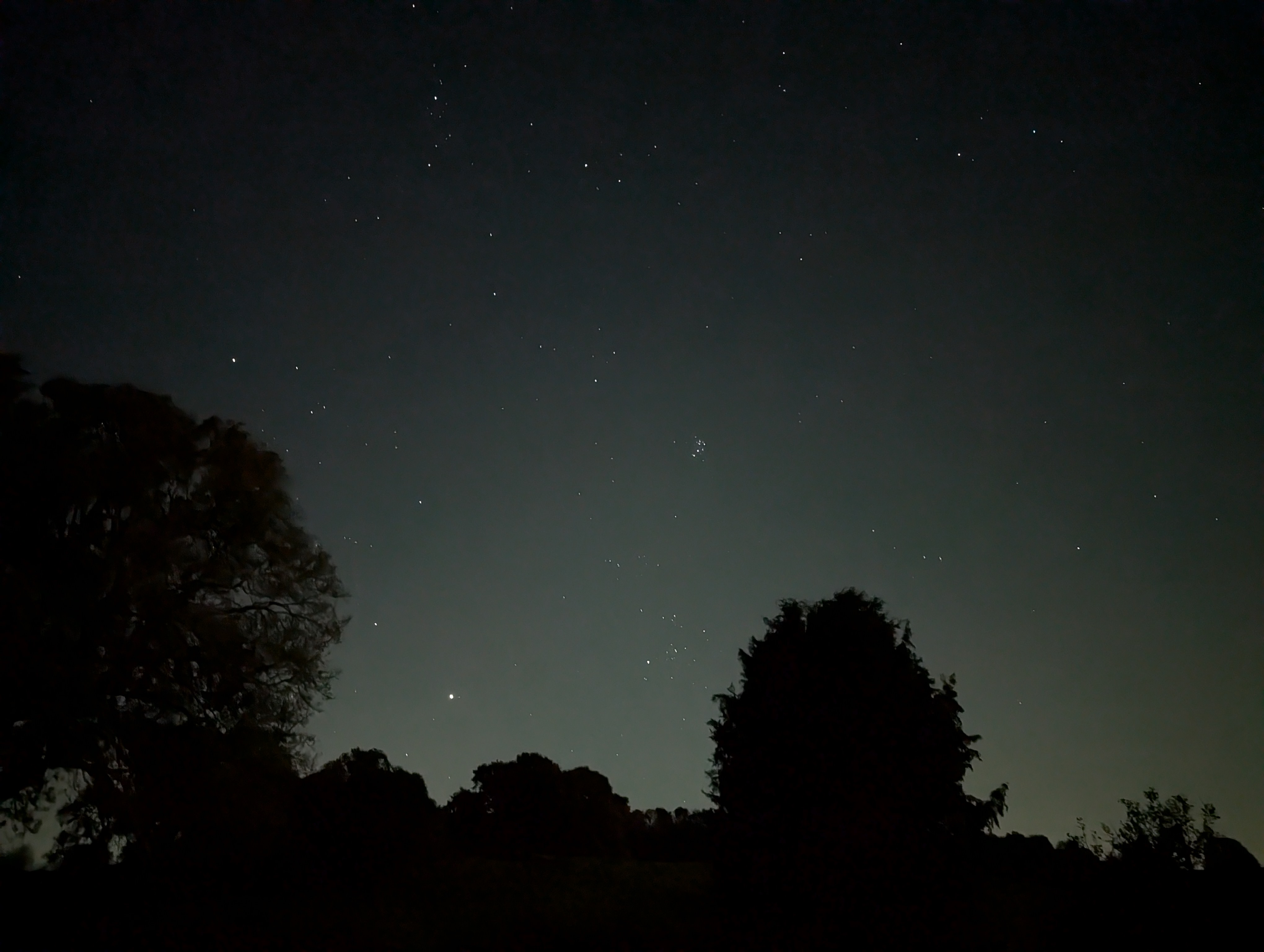 | Jupiter is visible near the horizon, together with the stars of Taurus, Auriga and Perseus, in this picture taken from the Society's Flamsteed Observatory on the 12th October 2024 by Mike Lancaster using a Google Pixel 8 Pro phone. Image Credit: Mike Lancaster. |
