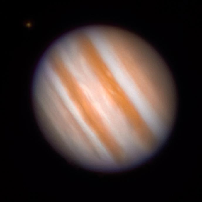 | This image of Jupiter was created by Chris Callaway using data collected on the 19th December 2024. The moon Io is visible at upper left. Chris used an 8-inch Meade LX200 telescope, a 2x Barlow lens, and a ZWO ASI 178MC camera. The video that was captured was then processed in AstroSurface using the best 61 out of 600 frames. Further processing was completed in Photoshop. Image Credit: Chris Callaway. |