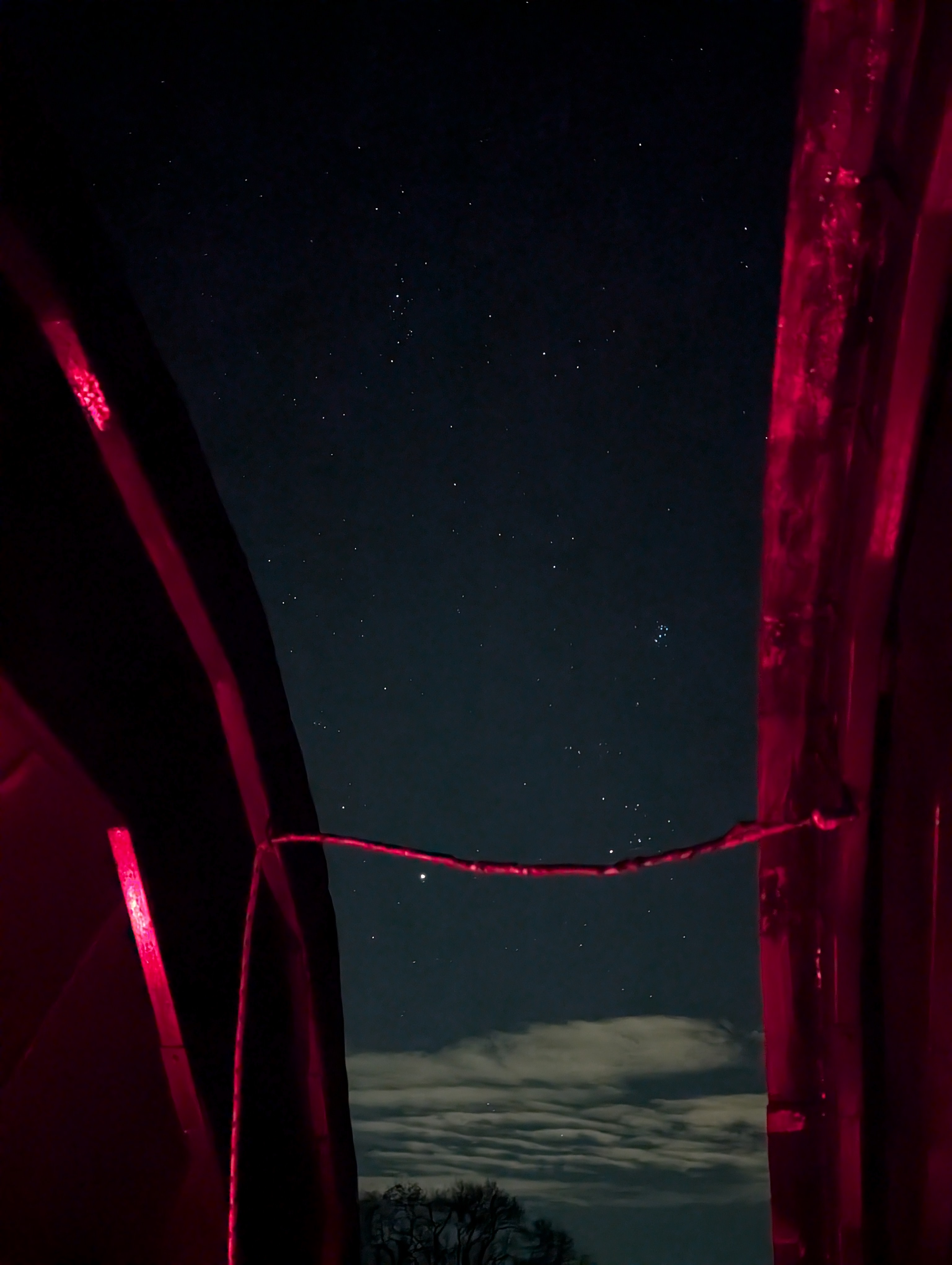 | This picture of the night sky was taken through the open dome of the Society's Flamsteed Observatory by Mike Lancaster on the 26th October 2024 using a hand-held Google Pixel 8 Pro phone. Jupiter is visible at lower left, just below the rope that crosses the dome gap. Aldebaran and the Hyades are at lower right, and above them the Pleiades. The stars of Perseus occupy the top of the frame. Image Credit: Mike Lancaster. |