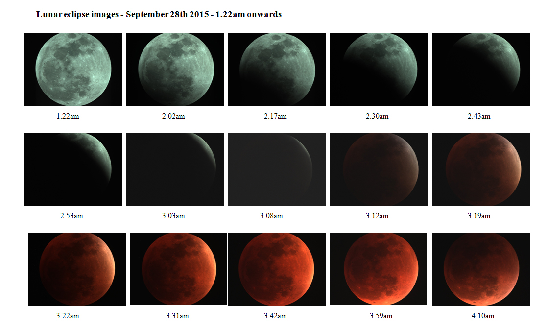 This collection of images was taken during the early hours of the morning of September 28th 2015 by Peter Branson. Each image is a single exposure. Peter comments: 'While any part of the Moon was illuminated the exposures had to be kept short - 0.001 s - 0.01 s. Only when the Moon was in shadow could the exposure be increased and then only to 2 - 5 s. Visually the change in colour/hue was not hugely significant at total eclipse. The colour change was not as great as shown in the images as no proper colour (RGB) balance has been applied in any of them. That's why the rust coloured ones are so much different and so much more spectacular that the rest.' The photos were taken with an ATIK 314L+ CCD camera attached to a TS Photoline ED102 refractor telescope with field-flattener and Hutech IDAS light pollution filter attached. The setup was mounted on an HEQ5 equatorial mount set to lunar tracking. The single image below the sequence is of the full lunar eclipse and was produced from eight 3 second exposures. The images were first converted from FIT files to TIFF files and then stacked in Registax. Colour was enhanced using the stretch function and then wavelets were used to sharpen the final image. Image Credit: Peter Branson.