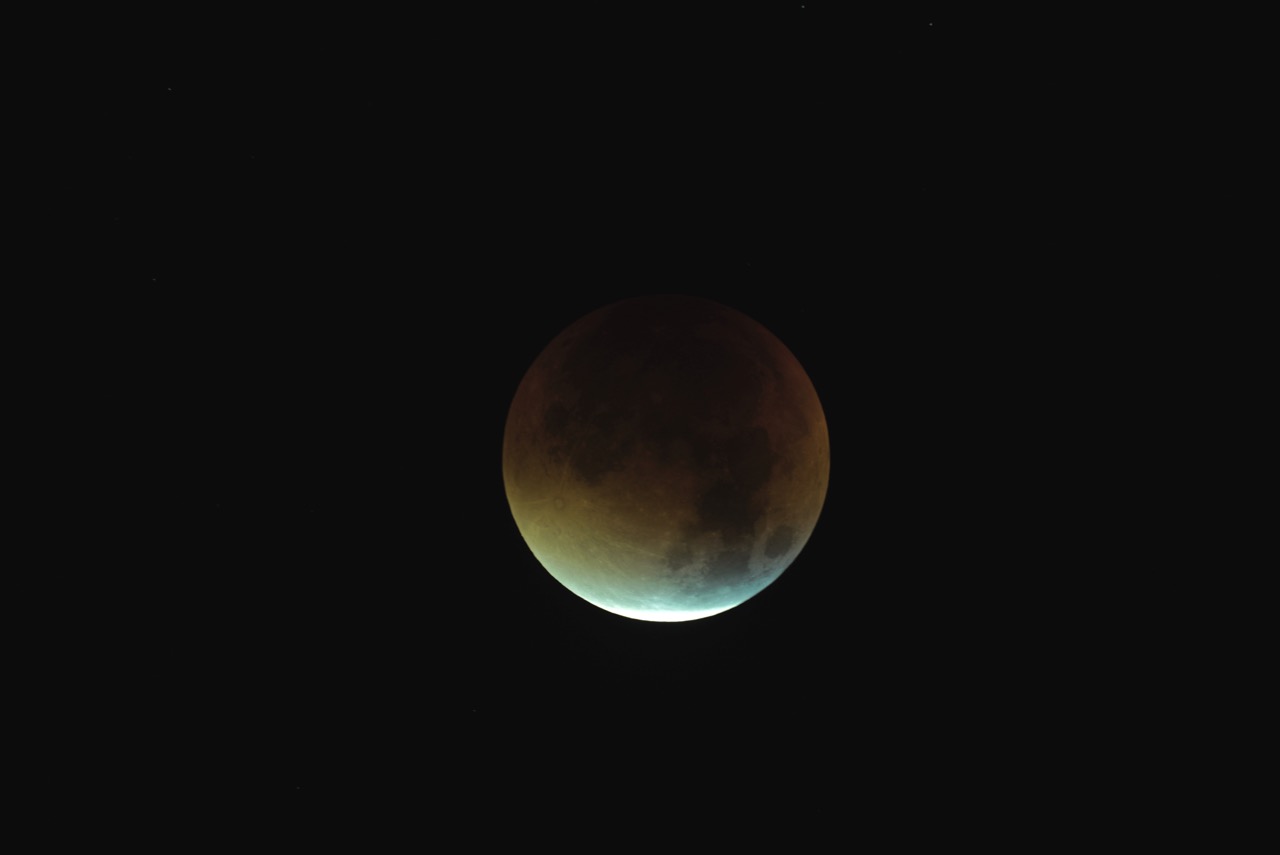 Taken during totality at 03:38 hrs. That's 91 minutes into the eclipse and 27 minutes into the total phase which itself was 9 minutes away from maximum. A 1/3 second exposure at ISO 6400. "It was nice to see the stars pop into view during totality".