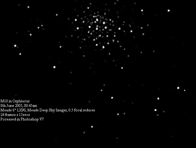 The following is a processed image of M10 in Ophiucus taken by Simon Allcock, Adrian Brown and Chris Newsome on the evening of 7th/8th June 2005. It was taken through Simon's 8" LX90, with Chris' Meade Deep Sky Imager and Adrian's 0.5 focal reducer - a real team effort!!!! The details are on the picture. Image Credit: Simon Allcock, Adrian Brown and Chris Newsome. |
