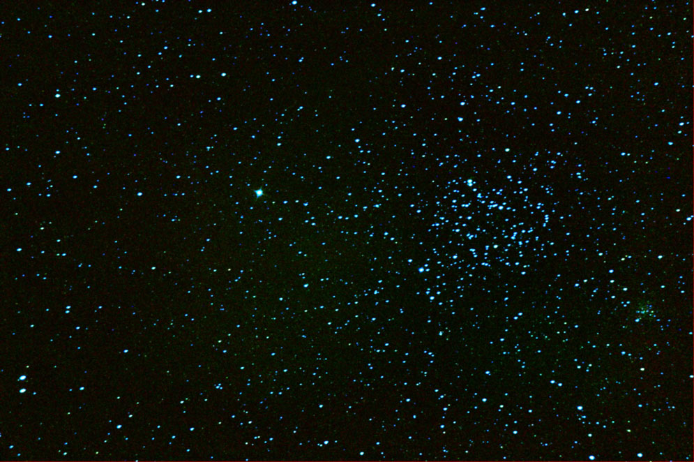 | The following images of M35 were captured by Dave Selfe on the 29th January 2022. The first is a full frame image, while below that is a cropped version showing a closer view. Dave used a Skywatcher Esprit 100ED telescope, Nikon D750 camera, and Optolong L-Pro filter. The image is comprised of 35 x 30 second exposures at ISO 800. The fainter and more compact open cluster NGC 2158 is visible close to M35 in the 5 o'clock position. The full frame image also captures the even fainter clusters IC 2156 and IC 2157, further out in the 5 o'clock position. Image Credit: Dave Selfe. |