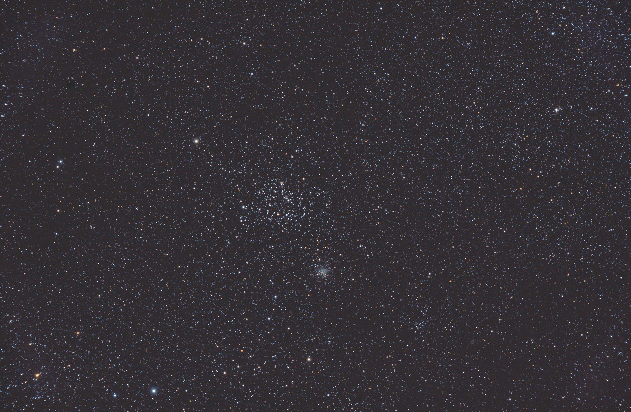 | Mike Lancaster captured this image of M35 on the 17th January 2024. It comprises 40 x 30 second exposures taken using an Altair Hypercam 26C at 300 gain (plus darks, flats and flat darks), through an Orion Optics UK AG12 Astrograph mounted on an EQ8 mount. A 0.95x Wynne Corrector and Astronomik CLS-CCD filter were also employed. Guiding wasn't needed this time due to the relatively short exposures. Images were acquired using SharpCap, and the processing was entirely performed in PixInsight. The more distant open cluster NGC 2158 lies at top left. Image Credit: Mike Lancaster. |