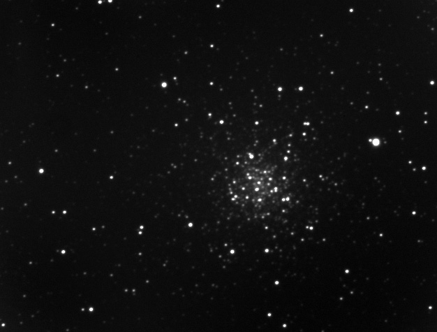 Adrian Brown took the following image of the globular cluster M56 in Lyra on 28th May 2005. The image was taken with a C11 SCT at F6.3 and an ATK-2HS camera. K3CCDTools was used to capture and stack the 8 individual frames that were taken, each of 45 seconds exposure. Image Credit: Adrian Brown.