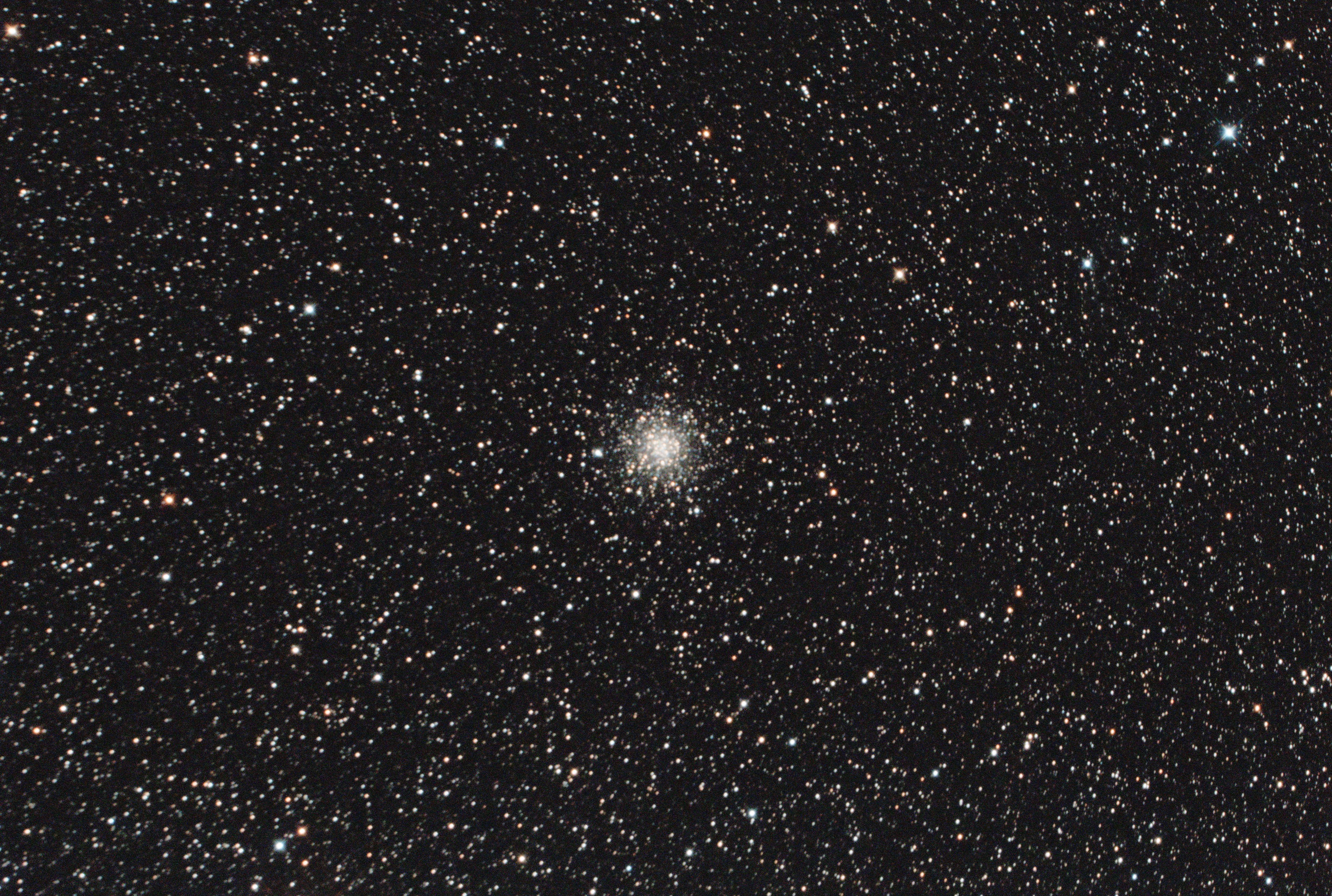 | This image of M56 was captured by Mike Lancaster on the 22nd July 2021. It is comprised of a stack 4x3 minute exposures taken with a Mallincam Universe camera attached to a 10-inch Meade ACF SCT on an EQ-8 mount. A 0.5x Mallincam focal reducer was also used. The camera was set to a gain of 16dB, a gamma of -20, a contrast of 0, noise reduction on, and full resolution. No guiding, flats or dark frames were used. Stacking and processing was done in Nebulosity 3.3 and Photoshop Elements 2020. Image Credit: Mike Lancaster. |