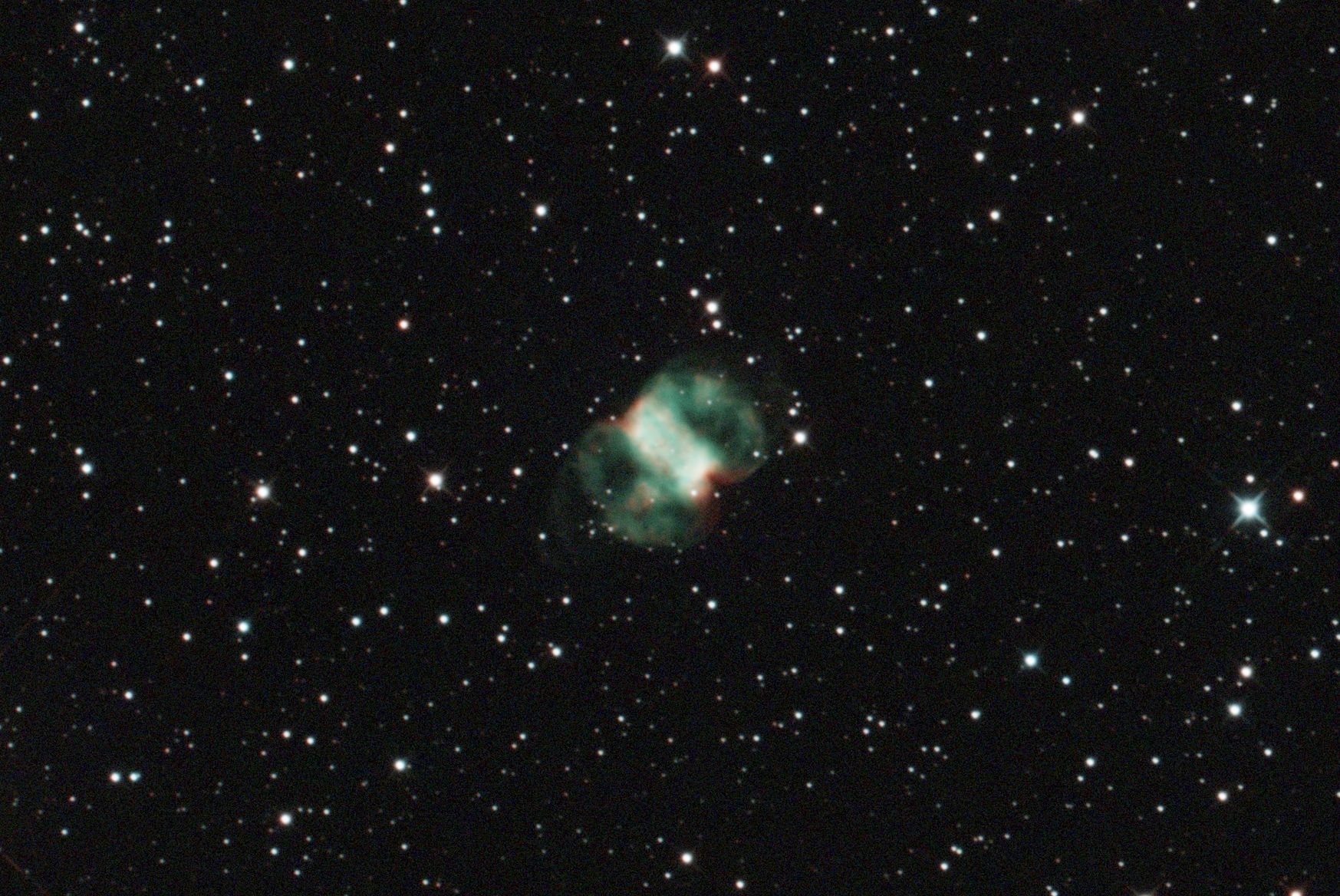 The data for this image of the Little Dumbbell Nebula was collected on numerous nights during November 2006 by Adrian Brown. He used a Skywatcher 80ED refractor at f7.5, an ATIK ATK16HR camera, Astronomik LRGB and CLS filters, and a Celestron CGE mount. The total exposure times were Luminance 80 minutes, Red 30 minutes, Green 30 minutes, and Blue 30 minutes. 5 minute sub exposure times were used throughout and the colour filtered exposures were taken with the camera binned 2x2. Image Credit: Adrian Brown.