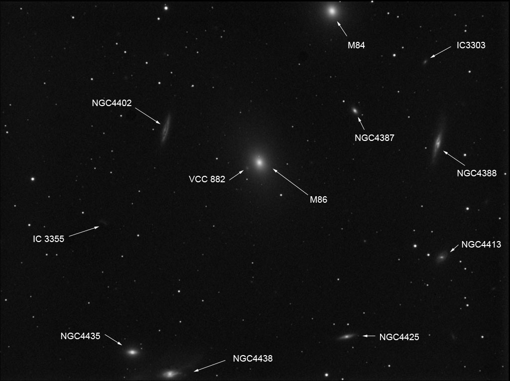 | The following image shows Markarian's Chain, a string of galaxies in the Virgo Cluster. The image was created with data taken by Chris Callaway on the 14th, 15th and 16th April 2021 from Coalville.  M84 is the prominent elliptical galaxy at the right hand end of the chain as seen in this picture. M84 has an almost spherical appearance though, and the bright elliptical galaxy M86 lies to the left of it. Other members of the chain mostly have NGC designations and an annotated image is provided below Chris' picture to aid in identification. The bright elliptical galaxy M87 lies to the left of the image.  The image comprises 10 x 10 min subs of Red, Green and Blue. Equipment was a Takahashi 106, the camera was an Atik 16200 with Atik filter wheel and filters, the mount was a Paramount MyT. The images were stacked in Astroart with further processing taking place in Photoshop and PixInsight.  Image Credit: Chris Callaway. |