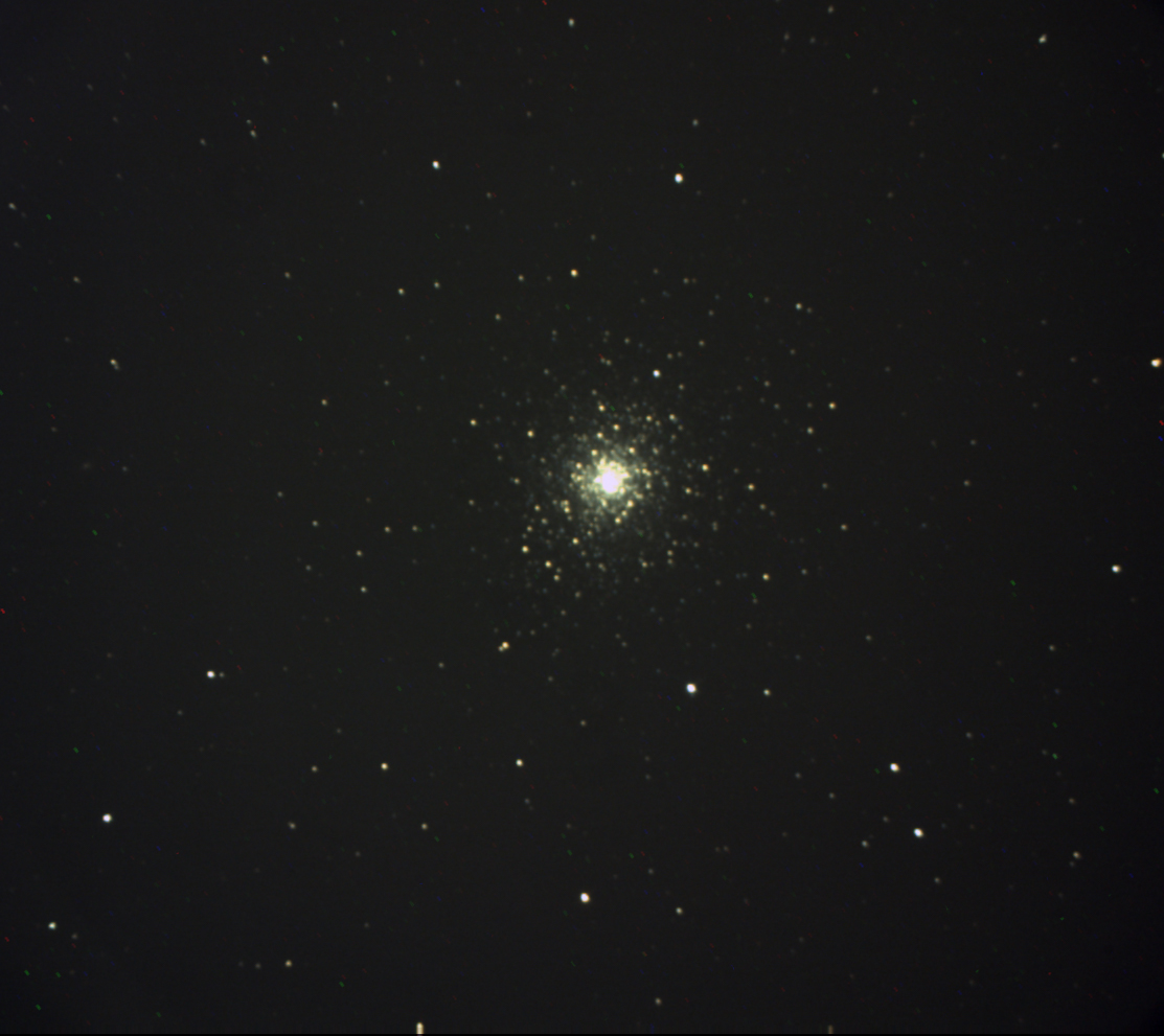 | This image of M92 was captured by Mike Lancaster on the 21st July 2021. It is comprised of a stack of four 4 minute exposures taken with a Mallincam Universe camera attached to a 10-inch Meade ACF SCT on an EQ-8 mount. A 0.5x Mallincam focal reducer was also used. The camera was set to a gain of 16dB, a gamma of -20, a contrast of 0, noise reduction on and 2x2 binning. No guiding, flats or dark frames were used. Stacking and processing was done in Nebulosity 3. Image Credit: Mike Lancaster. |