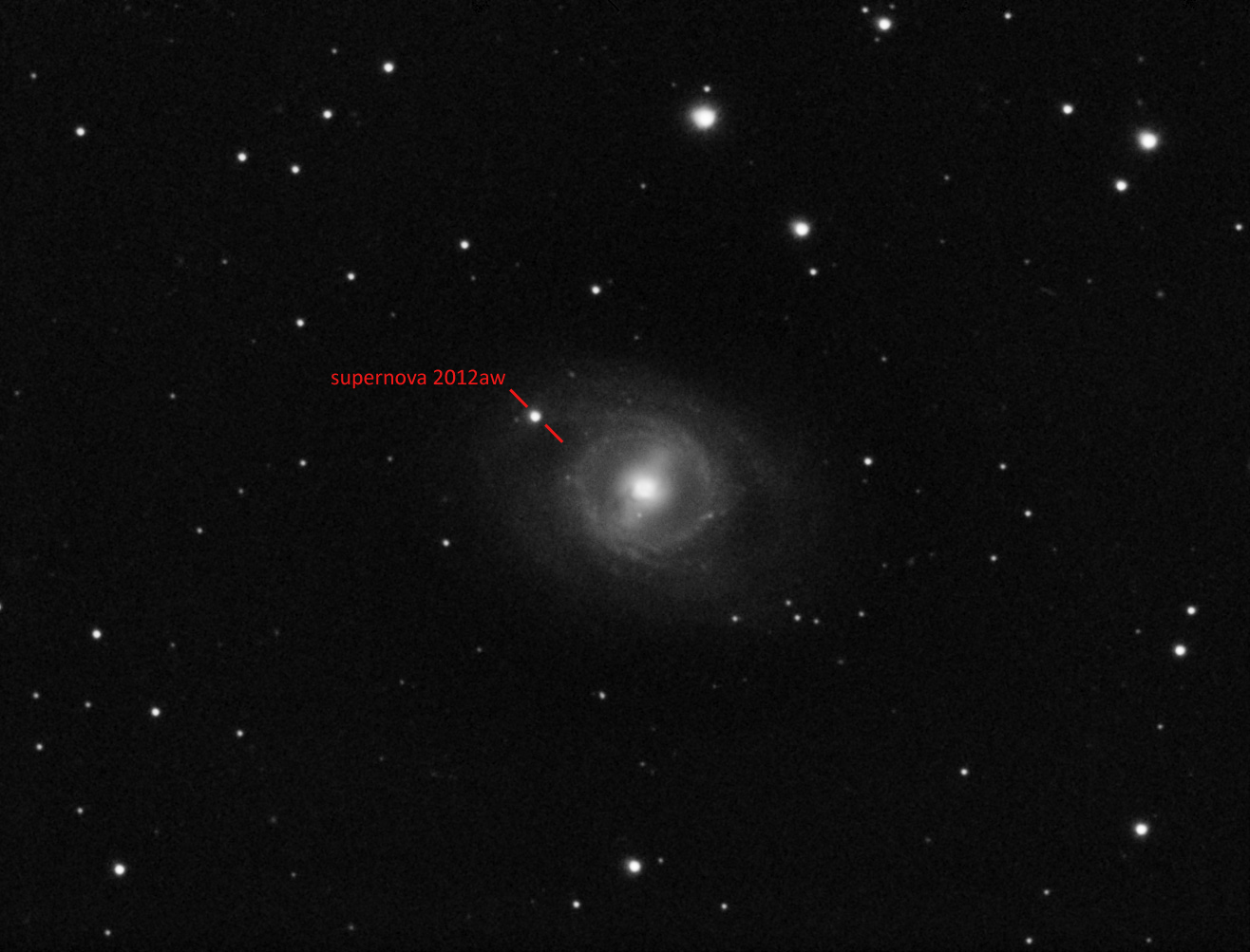 | Adrian Brown collected the data for this image of M95 on the 25th, 26th and 27th of March 2012 using his Celestron 5" f/10 Schmidt-Cassegrain, an ATK16HR CCD camera and Astronomik Luminance and CLS light pollution filters. It is comprised of 37 x 5 minute exposures. The image also captures supernova SN 2012aw, the position of which is marked in the second version of the photograph below. Image Credit: Adrian Brown. |