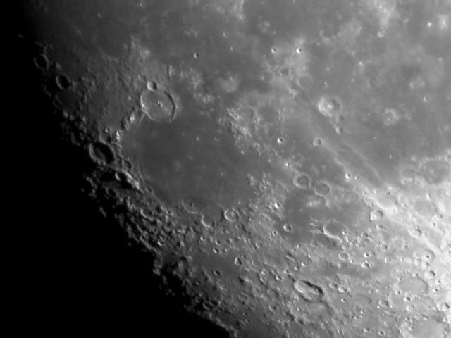 The following image of the 12.5 day old Moon was taken by Chris Newsome on the 8th June 2006. He used a Meade LPI camera with a Celestron C8-NGT telescope. The image is comprised of a total of 11 separate images stitched together in CS2. The 11 images are themselves comprised of a total of 1550 frames stacked in Registax. Chris comments that "The Moon was very low down in the sky and, bearing in mind the heat of the previous day, the atmospheric turbulence was horrendous - it was like looking through a jelly! However the stacking process has helped in eliminating the atmospheric effects to a certain extent although the overall image is still blurred". Looks fine to me Chris - webmaster. Image Credit: Chris Newsome. |