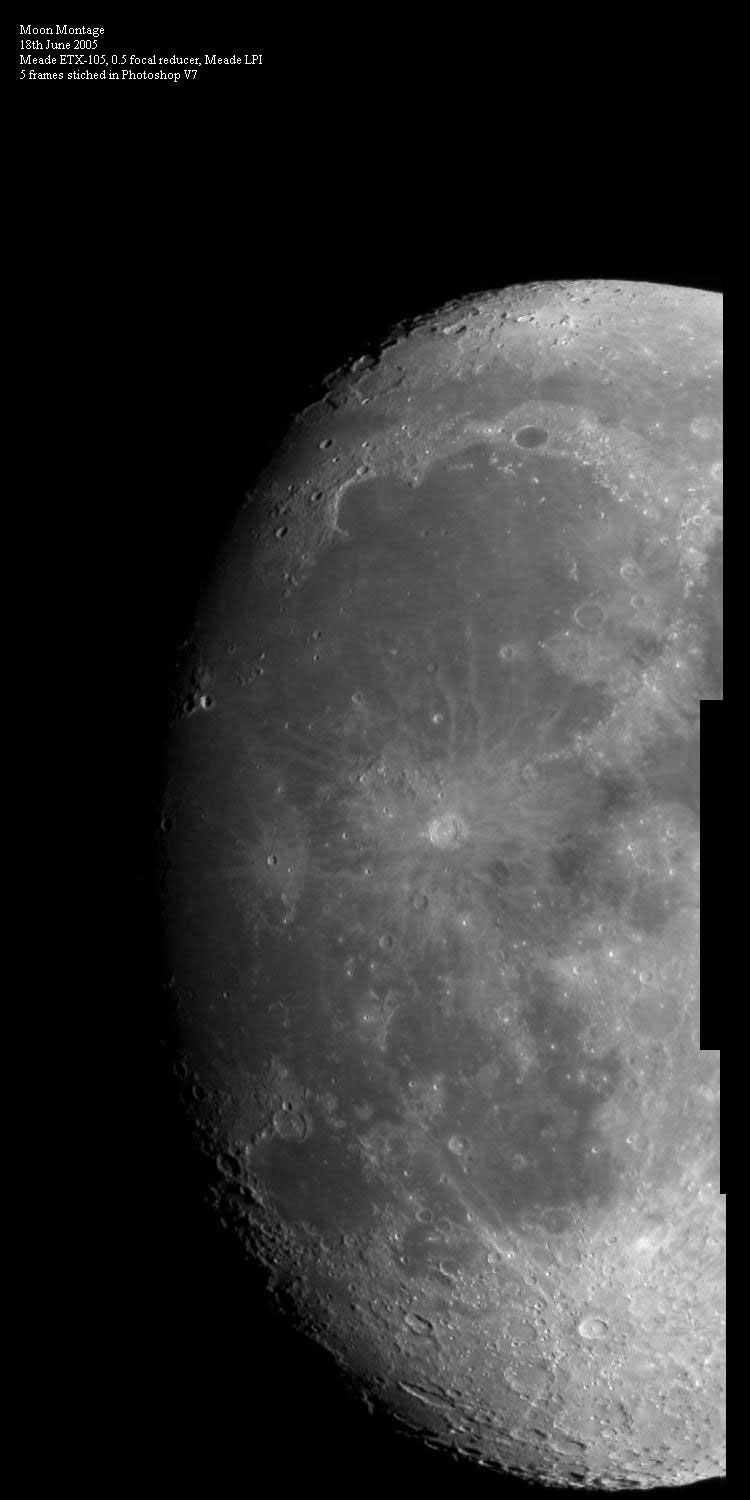 The following set of 6 images show the 12 day old moon and and close ups of 5 regions on it. They were taken by Chris Newsome on the 18th June 2005. To see these images with features named click here. Image Credit: Chris Newsome. |