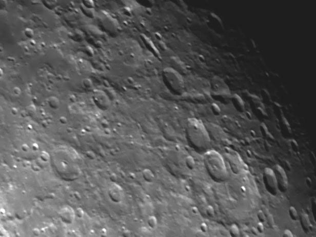 | This close up view of the Moon shows the he Rheita Valley region near to the terminator. It was taken by Chris Newsome on the 9th September 2006 using a Meade DSI camera and 2x Barlow lens through a Celestron C8-NGT. The image is a stack of 133 frames, combined in MaximDL and then processed in CS2 adjusting the levels and curves and then adjusting the exposure value using Gamma, Offset and Exposure sliders. The image was taken in black and white. Image Credit: Chris Newsome. |