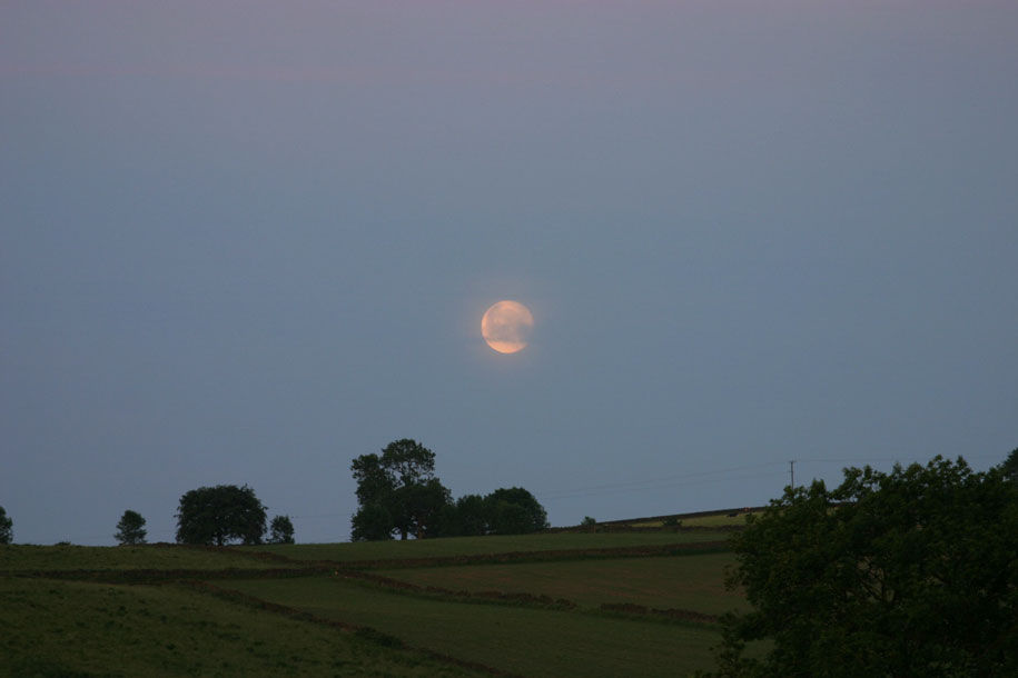 | Chris Newsome captured this image of the Moon setting over the fields at Alderwasley in Derbyshire at 4:33 BST on the 13th June 2006 using a Canon EOS 300D camera and a 200 mm lens. A few minutes later Chris took a picture of the Sun rising over Crich Stand from the same spot. Image Credit:Chris Newsome. |