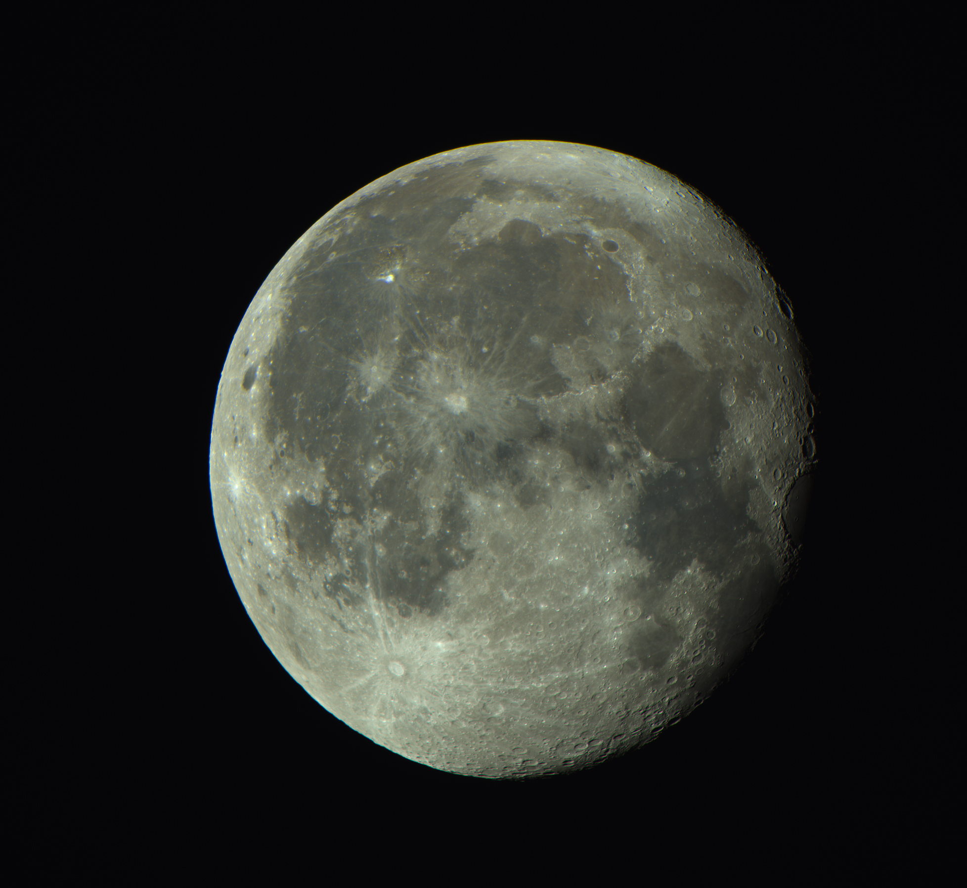 | This image of the Moon was captured by Peter Branson on January 19th 2022 and is made from a stack of 500, 5ms images taken with a ZWO ASI533 cooled colour camera together with a 102mm TS Optics Photoline f7 telescope with a Hutech IDAS light pollution filter and field flattener attached, mounted on an NEQ6 mount. The images were stacked in Nebulosity and some slight sharpening was done in RegiStax. Image Credit: Peter Branson. |