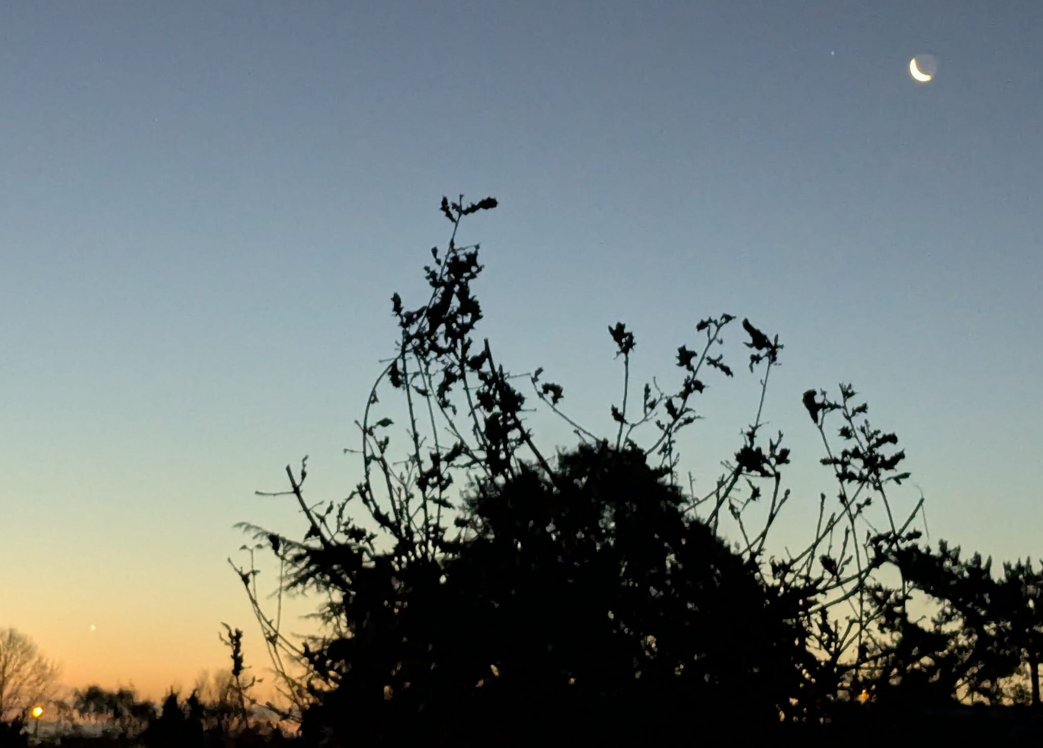 Jim Sarsgard took this picture of the Moon at 06:40 on the morning of the 17th November 2025. The star Spica is visible just to the left of the Moon, and Venus is barely visible in the dawn glare at lower left, just above the treeline. Jim used a Google Pixel 6A phone camera in night mode. Image Credit: Jim Sarsgard. |