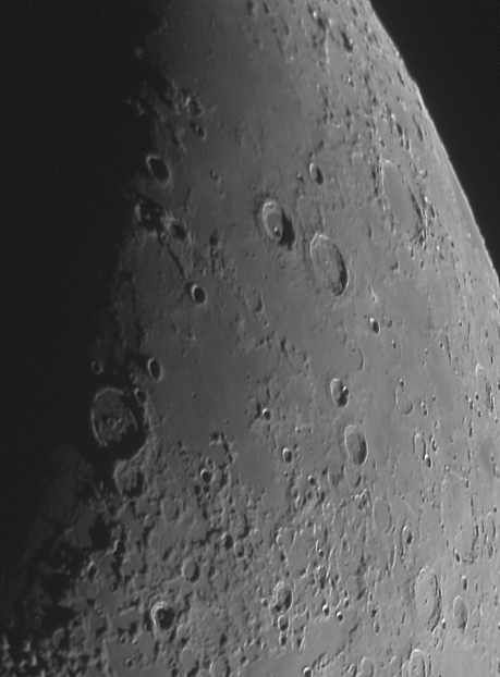 | The first image shows part of the north-east region of the Moon. The prominent crater Posidonius lies on the terminator and the smooth area to the right of it is part of the Lacus Somniorum. In the two o'clock position from the centre of the image are the pair of craters Atlas (the larger of the two) and Hercules. Between Atlas and the lunar limb lies the somewhat foreshortened crater Endymion. A part of the Mare Humboldtianum is just visible on the limb beyond Endymion. This image is an 85 frame 37 multipoint stack. Image Credit: Chris Newsome. |