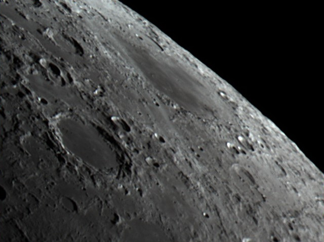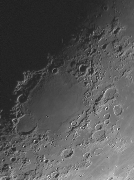 | This image shows Crater Endymion and Mare Humboltianum and was taken by Peter Branson on the 1st April 2017. It was obtained from several 2000-frame videos. Each video was first processed in AutoStakkert and the best 10% of these frames were stacked. The resulting image was imported into Registax and, using the wavelets tool, further sharpening was applied. The video was taken with a ZWO ASI224-Cool high frame rate camera, operating at about 50 frames per second, through a Hutech IDAS light pollution filter attached to a Celestron C9.25 Schmitt-Cassegrain telescope. The telescope arrangement was mounted on an HEQ5 mount. Image Credit: Peter Branson. |