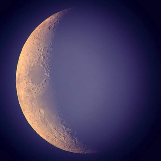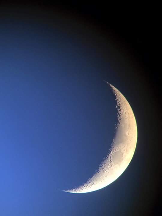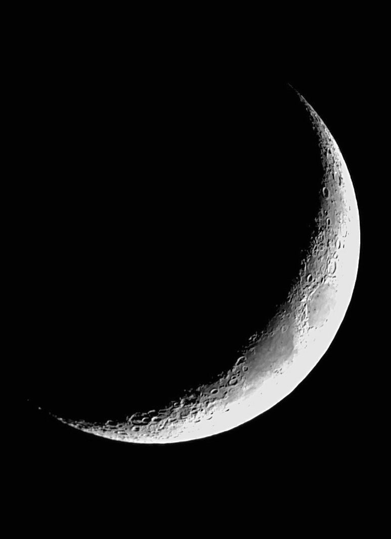 | Jim Sarsgard took this picture of the 4 day 9 hour old moon on the evening of the 10th June 2024. He used a Canon 1000D camera attached to a 102mm Sky Watcher Maksutov. The exposure was 1/15 second at ISO400 and f/11. Image Credit: Jim Sarsgard. |