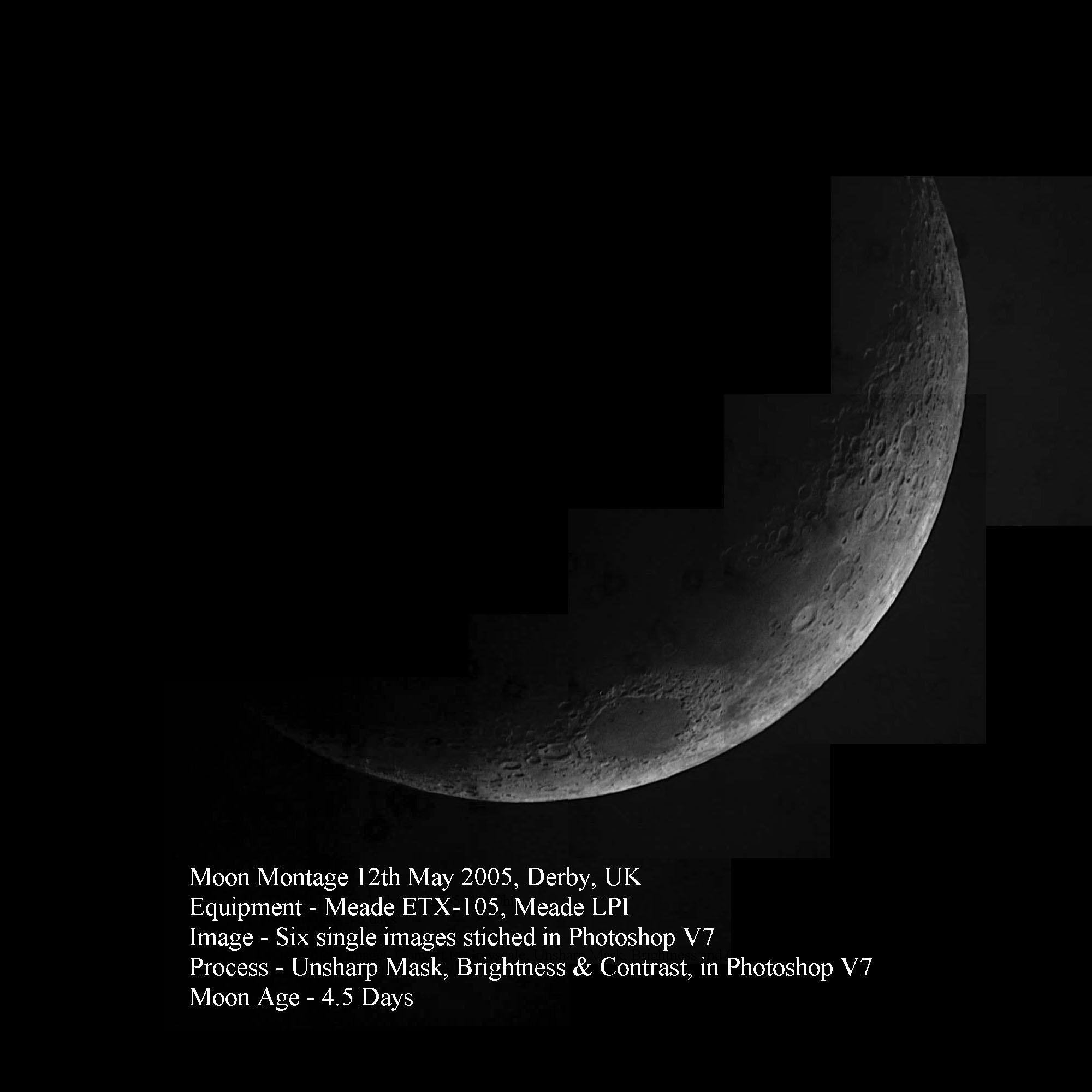 The following picture by Chris Newsome is a montage of 6 images comprising the 4.5 day old Moon taken on the 12th May 2005. Image Credit: Chris Newsome. |