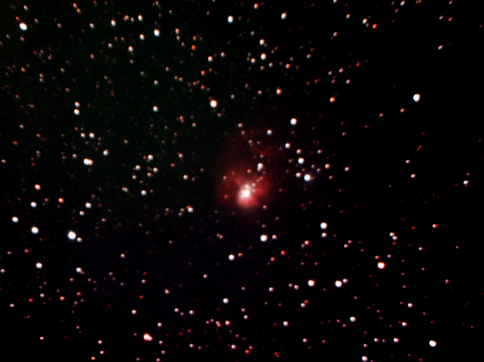 | This image of NGC 1931 was captured by Mike Lancaster on the 6th March 2022. It is comprised of 10 x 10 minute exposures taken through a 10" Meade ACF SCT using a 0.5x Mallincam Focal reducer, Astronomik CLS CCD filter and Mallincam Universe camera at 22 dB gain and 2x2 binning. This setup was guided using an SXV Lodestar camera through an OVL off-axis guider and PHD2. The images were stacked in Deep Sky Stacker, and cropped and processed in Nebulosity 4 and Photoshop Elements 2020.  Image Credit: Mike Lancaster. |