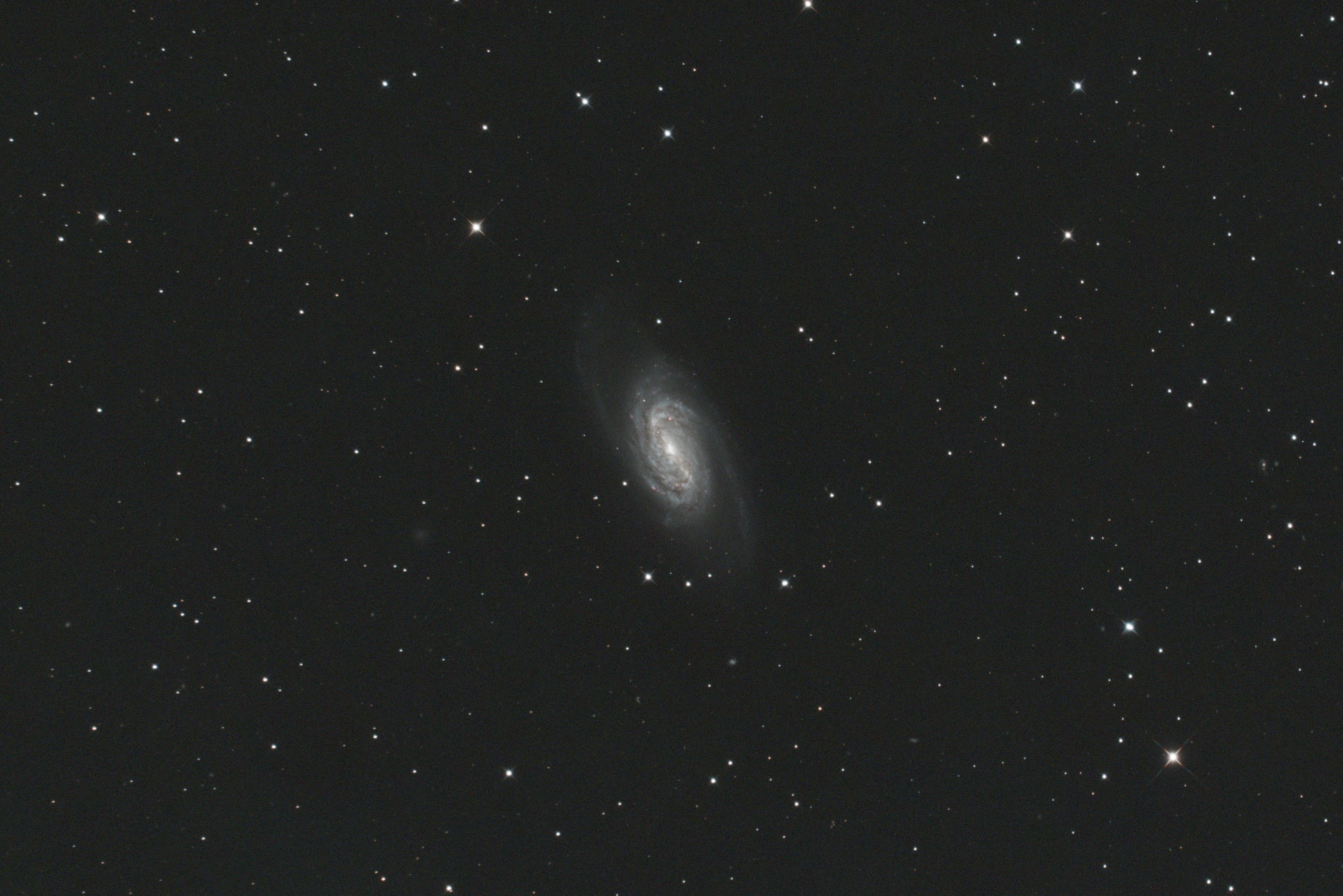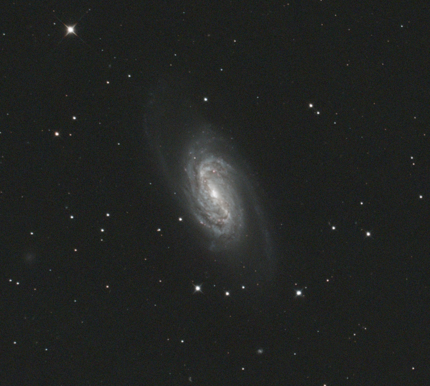 This image of barred spiral galaxy NGC 2903 was captured by Mike Lancaster on the 17th March 2026. Both close-up and wide-field versions of the same image are shown. The faint dwarf galaxy UGC 5086 lies to the left of NGC 2903 in the 8 o'clock position, and appears as a faint fuzzy patch. The image comprises 120 x 30 second exposures taken using an Altair Hypercam 26C at 300 gain (plus darks, flats and flat darks), through an Orion Optics UK AG12 Astrograph mounted on an EQ8 mount. A 0.95x Wynne Corrector and IDAS LPS-D3 filter were also employed. No guiding was required due to the relatively short exposures. Images were acquired using SharpCap, and the processing was entirely performed in PixInsight. Image Credit: Mike Lancaster.