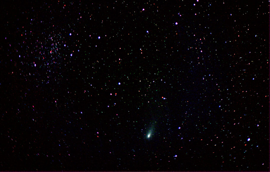 | Chris Newsome inadvertently captured the open cluster NGC 6940 in Cygnus while imaging Fragment C of Comet 73P Schwassmann-Wachmann on the night of the 11th - 12th May 2006. The cluster may be seen at the top left section of the picture. The image is comprised of 20 frames of 150 seconds each taken with a Canon EOS300D camera at 200 ASA through a Skywatcher 80T refractor over a period of 56 minutes. The setup was guided by a Meade DSI and a Celestron C8-NGT using MaximDL. The setup had not been drift aligned hence the rotation effect of the stars on the left of the image.  Image Credit: Chris Newsome. |