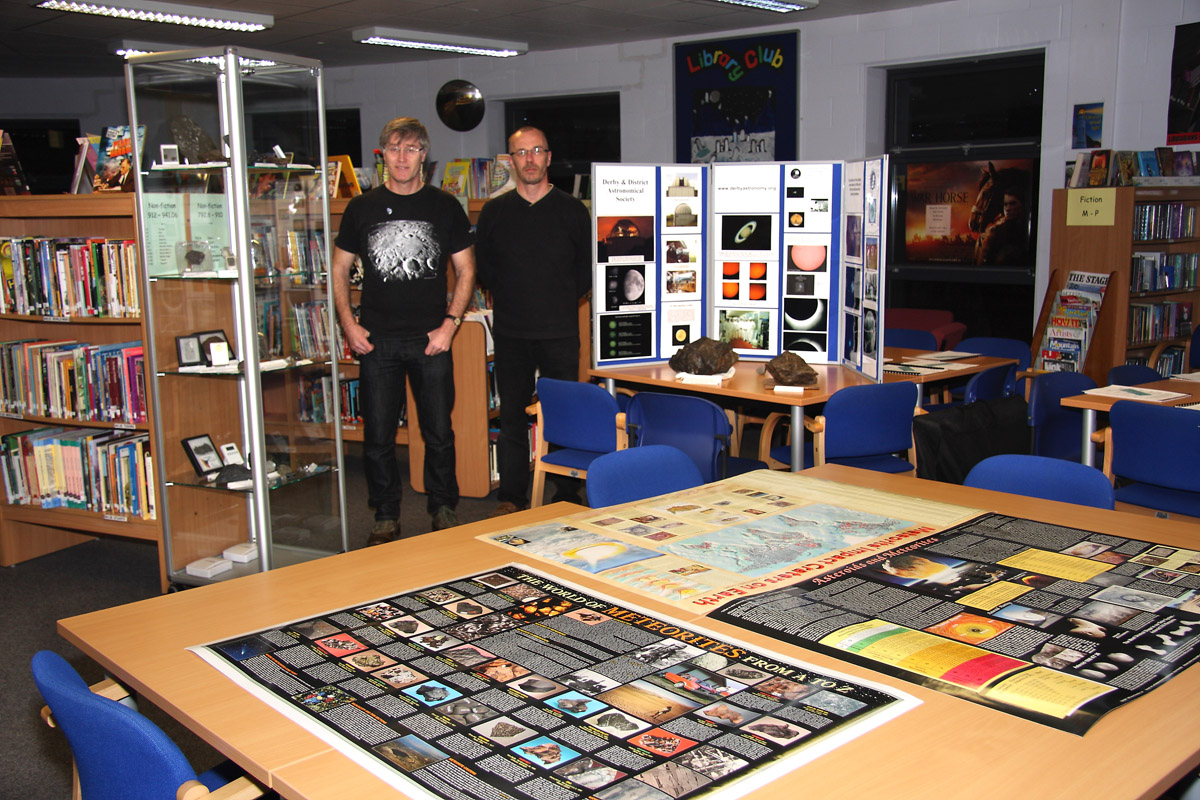 ![]() Graham Ensor and Chris Newsome in Long Eaton School library with samples from Graham's meteorite collection and the DDAS display. |