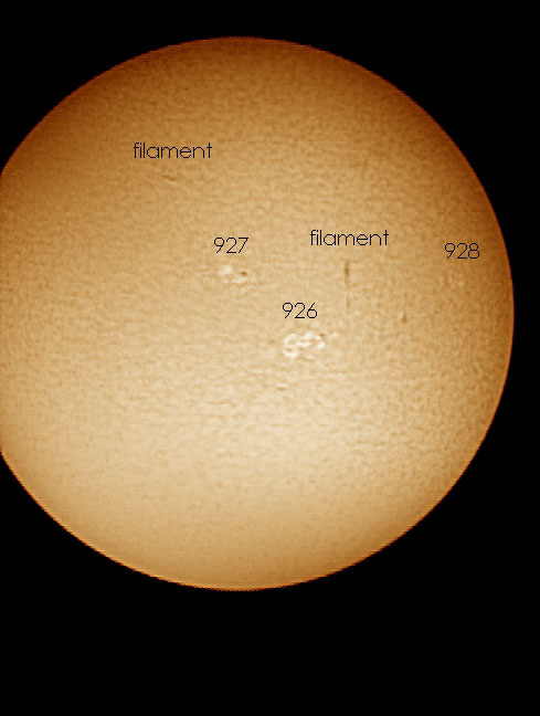 | There were three sunspot groups visible on the sun on the 2nd December 2006 - 926, 927 and 928 although 928 wasn't readily visible in white light. In H-alpha it could clearly be seen. The following two images by Chris Newsome show these sunspots in white light (first image) and in H-alpha. The white light image shows sunspot groups 926 and 927 and was taken with a Canon EOS300D camera through a Celestron C80NGT. It is comprised of two images that have been superimposed. One of them was taken with a neutral density filter (taken at 100ASA, 1/10th second) and the other was with the neutral density filter and a Baader Solar Continuum Filter to increase the contrast (100ASA, 1 second). They were processed in CS2 and then layered together to form the final image. The H-alpha image is comprised of 135 frames (at 0.010 second) through a Coronado Personal Solar Telescope with a Meade DSI camera. They were stacked in Registax V4 and then processed in CS2. The H-alpha image clearly shows group 928 together with a couple of filaments.  Image Credit: Chris Newsome.    |