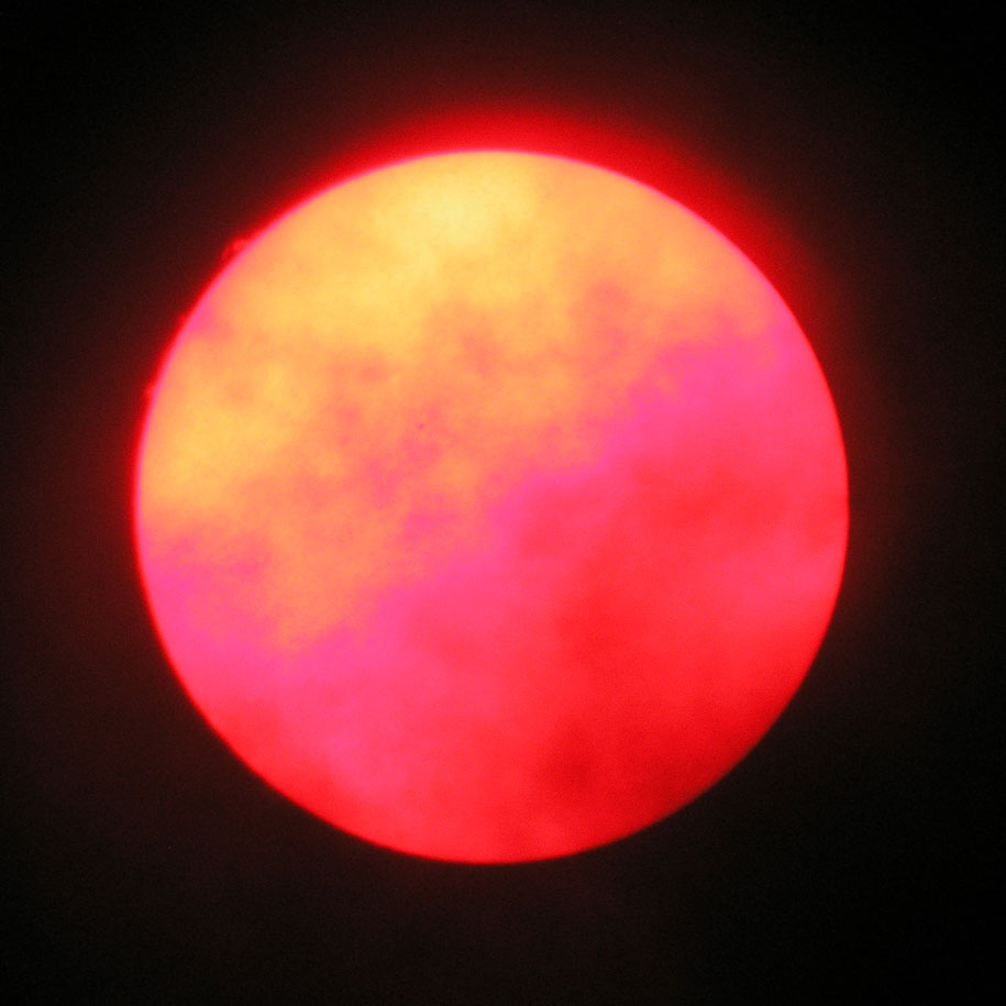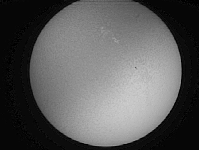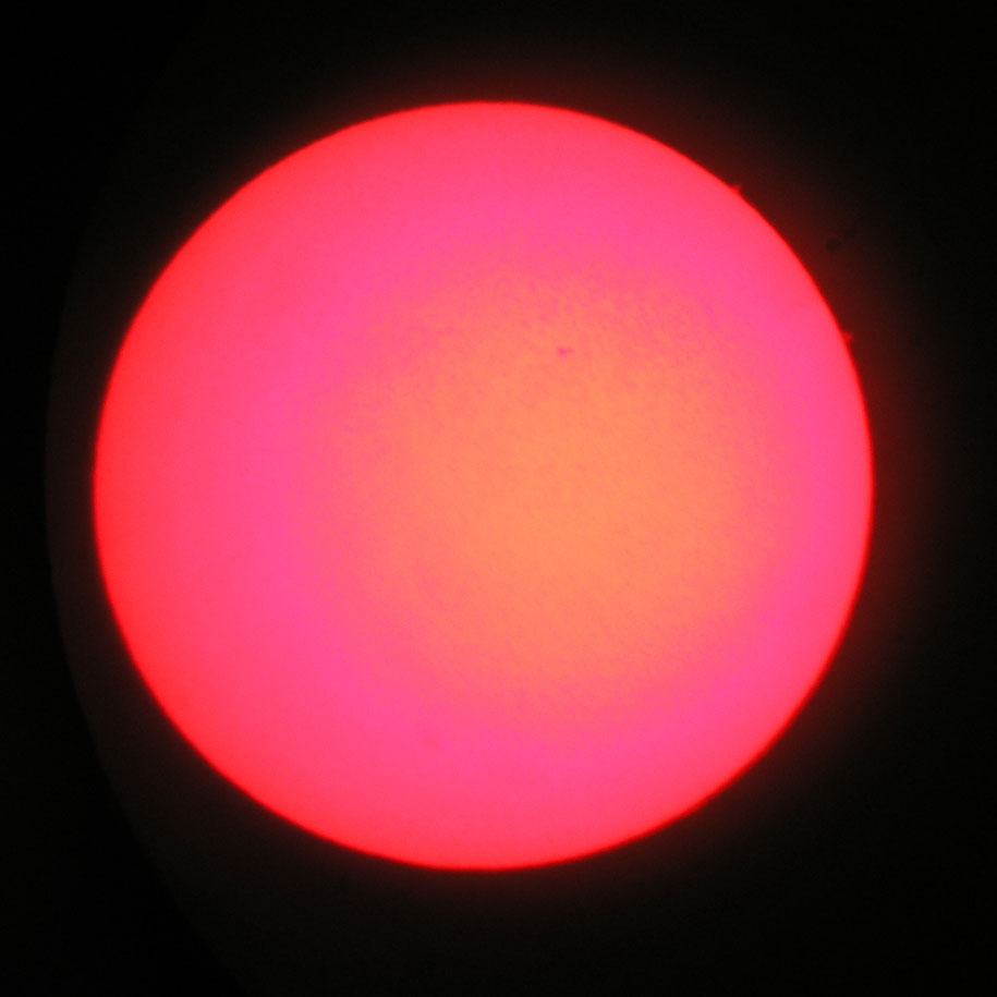 | Dave Selfe took this image of the Sun in H-alpha with his Coronado Personal Solar Telescope (PST) in August 2006. The PST has a hydrogen alpha filter with a bandpass of less than 1.0 angstrom and the image was taken using the 20mm Kellner eyepiece that was supplied with the telescope and an Olympus C5000 digital camera on automatic. Dave comments: "It was pretty cloudy when I took the image and the sun kept disappearing behind the clouds but I hope to get a sunny weekend sometime when I can spend more time experimenting with different eyepieces and hopefully I'll get some better images. The images are nowhere near as good as the visual experience, it really is amazing."  Image Credit: Dave Selfe.   |