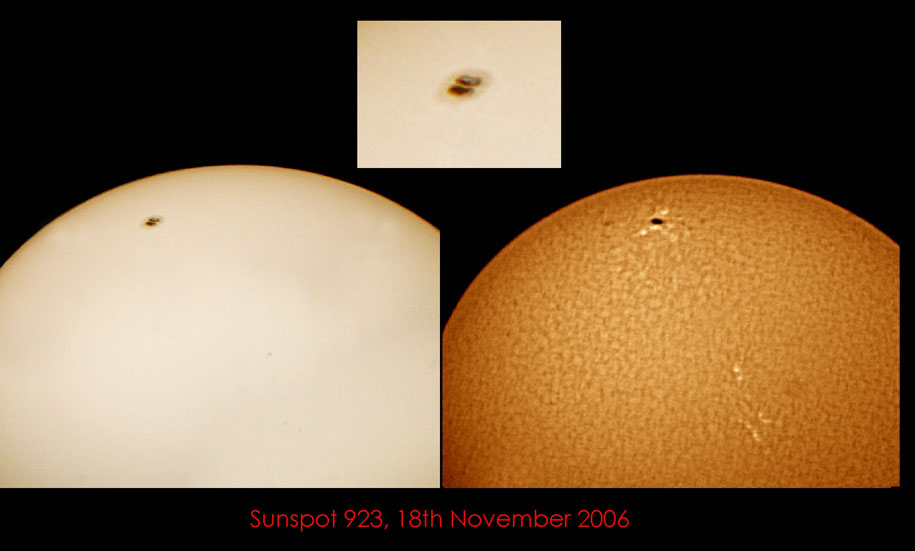 | The following montage of solar images was taken by Chris Newsome on the 18th November 2006 and shows sunspot 923. The image on the left was taken with a neutral density filter using a Canon EOS300D camera and a Celestron C8-NGT telescope (11 frames, 100 ASA, 0.4 seconds). These were combined in MaximDL and processed in CS2. A close-up of the sunspot is shown in the center of the montage. On the right is a photo of the same region taken in H-alpha light using a Coronado Personal Solar Telescope and Meade DSI camera (100 frames, stacked in Registax v4 and processed in CS2).  Image Credit: Chris Newsome.   |