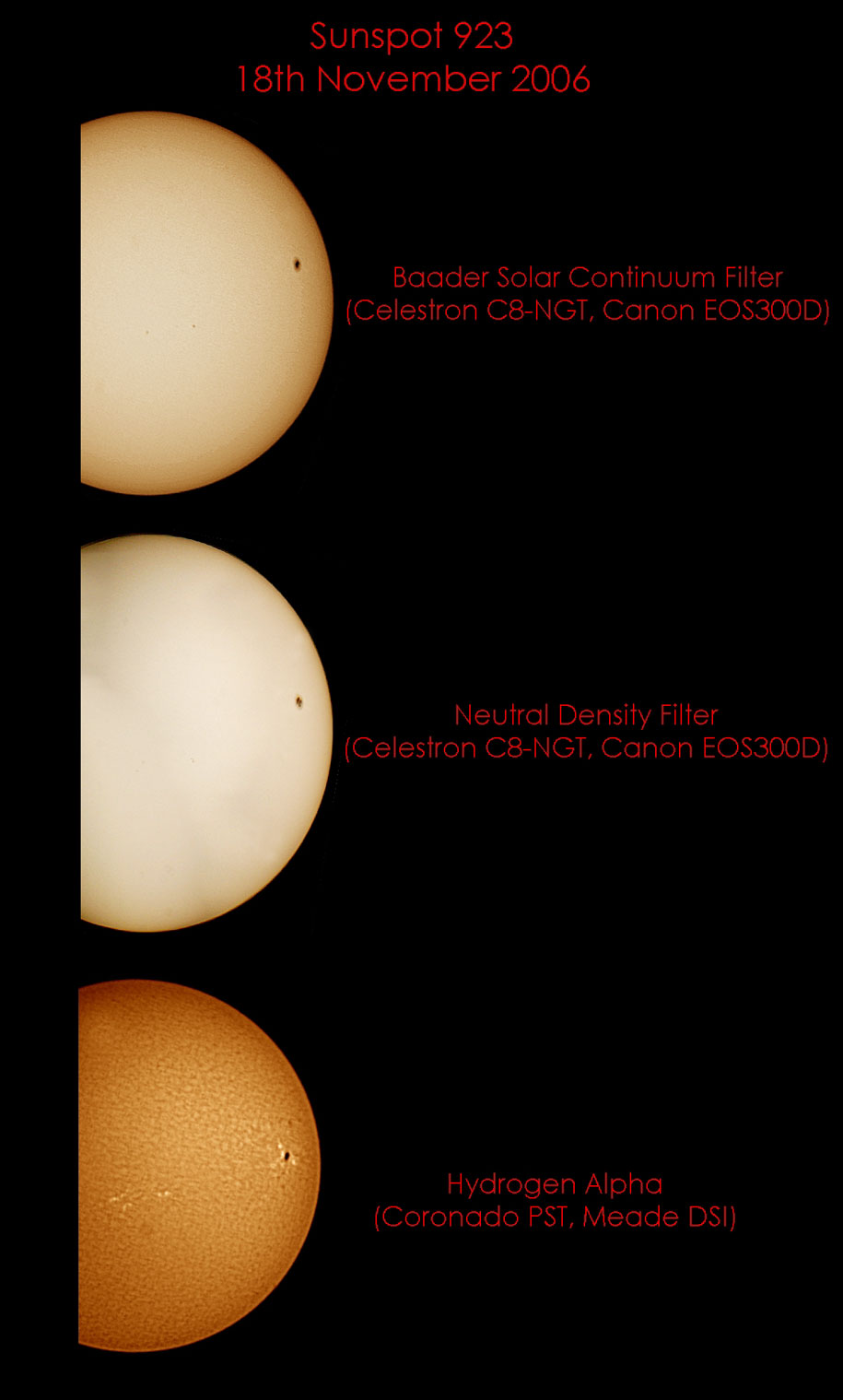 | Here is another montage of sunspot 923 taken by Chris Newsome on the 18th November 2006. This one includes an image taken through a Baader filter as well as neutral density and H-alpha images.  Image Credit: Chris Newsome.   |