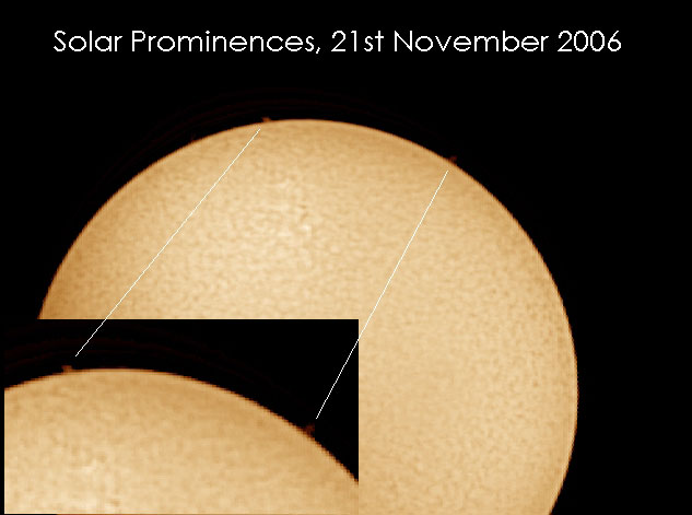 | Chris Newsome captured a couple of prominences erupting from the solar limb on the 21st November 2006. The image is comprised of 265 frames taken with a Meade DSI camera through a Coronado Personal Solar Telescope (PST), stacked in Registax and processed in CS2.  Image Credit: Chris Newsome.   |