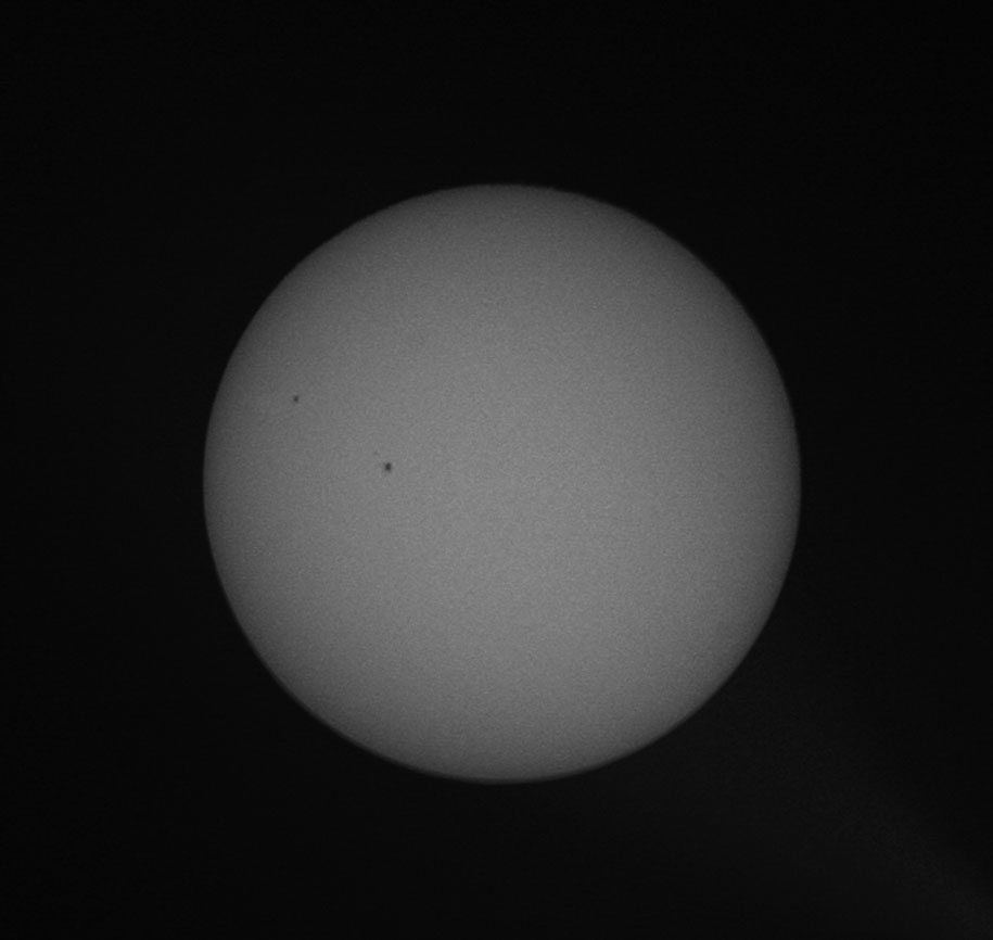 | The following picture of the Sun was taken by Chris Newsome on the morning of the 30th March 2006. It shows sunspots 865 and 866. Sunspot 865 is nearer the centre of the disc than Sunspot 866 and was already larger than the Earth when the picture was taken. Chris used a Canon EOS 300D camera at the prime focus of a Celestron C6-N telescope using a solar filter. Five images taken at 400 ASA were combined in MaximDL, processed in CS2 and converted to greyscale for the final image.  Image Credit: Chris Newsome.   |
