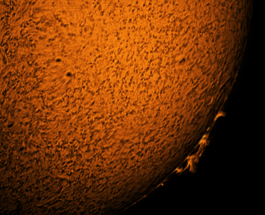 | DDAS member Pete Hill took the following four images of the Sun on the 26th August 2015. They include the large sunspot 2403 and were taken using a Coronado PST piggybacked on a Sky watcher Evostar 120 mm on an HEQ5 pro mount, with a DMK41 mono CCD camera at 15 fps. Exposure was about 1/3000 s for the disk and 1/300 s for the prominences. The images are composites of disk and prominence images. 600 frames of.avi videos were stacked in AutoStakkert, with wavelets tweaked in Registax 6, and the images combined and colourised in Photoshop CS6. The first (top) image shows the full disk, prominences, sunspot 2403 near the top, granulation on the disk, filaments, and plages around the sunspot. The second image shows a prominence and sunspot 2403 and was taken using a x2 Barlow. The third image shows another prominence at the bottom of the disk and also used a x2 Barlow. The fourth (bottom) image is a close-up of sunspot 2403 taken with a with x3 Barlow, and the banding on the image is due to interference patterns produced by reflection from the Barlow lens and blocking filter. Images Credit: Pete Hill. |