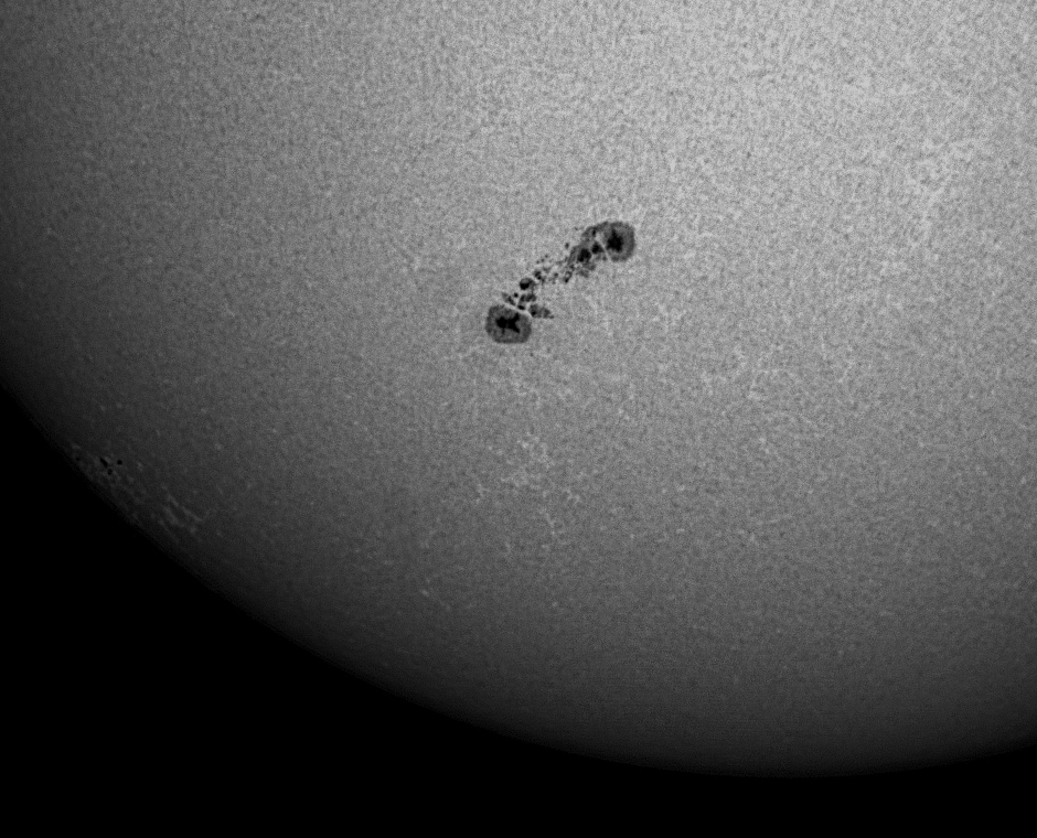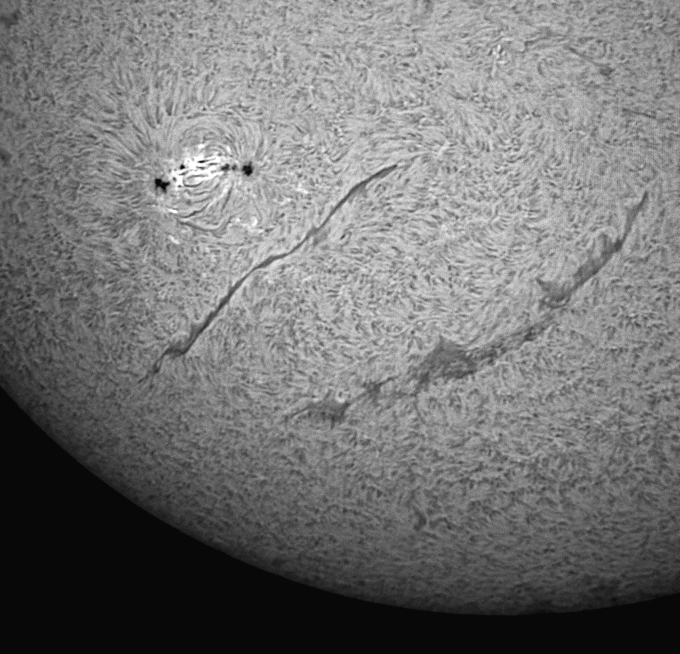 | The following four images of the sun were captured in a variety of different wavelengths by Pete Hill on the 10th July 2022. They show two large sunspots on sun with minor ones heading to the right hand edge. The top image shows the sun's full disk and was taken using a DMK41 mono CCD camera with x0.5 focal reducer and Baader continuum filter, using a Herschel wedge through a Sky-watcher ST102 telescope on an HEQ5 Pro mount tracking at the solar rate. The second image employed the same setup but a x2 Barlow was added to get a close up on the lower sunspot AR3055. In the third image the continuum filter was swapped with a Ca K filter. Finally, the fourth image employs the same camera and x2 Barlow, but mounted on a Coronado PST telescope piggy backed on the Skywatcher ST102 to image the sunspot with associated filaments in H alpha. Images Credit: Pete Hill. |