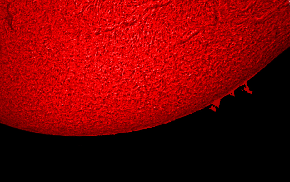 | Pete Hill captured the following images of the Sun in Ha on the 12th August 2022. He used a Coronado PST solar scope on an HEQ5Pro mount tracking at the solar rate. A DMK41 mono CCD camera was used to take the images, with a 2x Barlow lens employed for the close ups of prominences. 1000 frame video capture was used, then Auto-Stakkert to stack the best 500 frames. The wavelets function in Registax 6 was used and then final processing and colourising in Photoshop CS6. The top image shows the full disc with prominences, the middle image the mid-left side of the solar disc and the third image the lower right hand side prominences in close up. Images Credit: Pete Hill. |