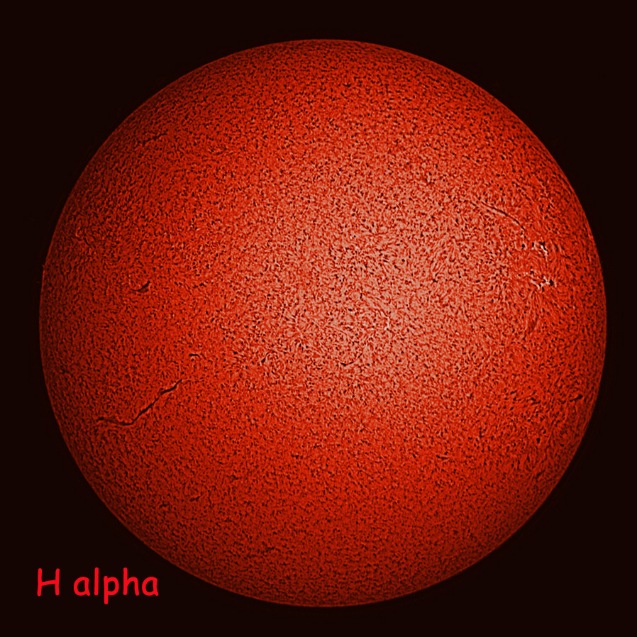 | Pete Hill took advantage of the clear skies on the 7th April 2026 to capture the following five images of the Sun. All images were captured using a DMK 41 mono camera, and in each case 1000 frames of video were stacked in Autostakkert3, and wavelets processed in Registax 6. All final processing, alignment, and colouration was done in Photoshop CS6. All used an HEQ5 pro mount tracking at solar rate. The first image is an H-Alpha view taken with a Coronado PST piggy backed on a Skywatcher 102 telescope. Next is a Calcium K image taken through a Baader CaK filter using a 0.5x focal reducer, viewing through a Herschel wedge attached to the Skywatcher 102. Following that is a visible light image taken using the same setup as the Calcium K image, but using a Baader Continuum filter instead. Finally the image of sunspots was taken using the same setup as the visible image but replacing the focal reducer with a Barlow lens. Images Credit: Pete Hill. |